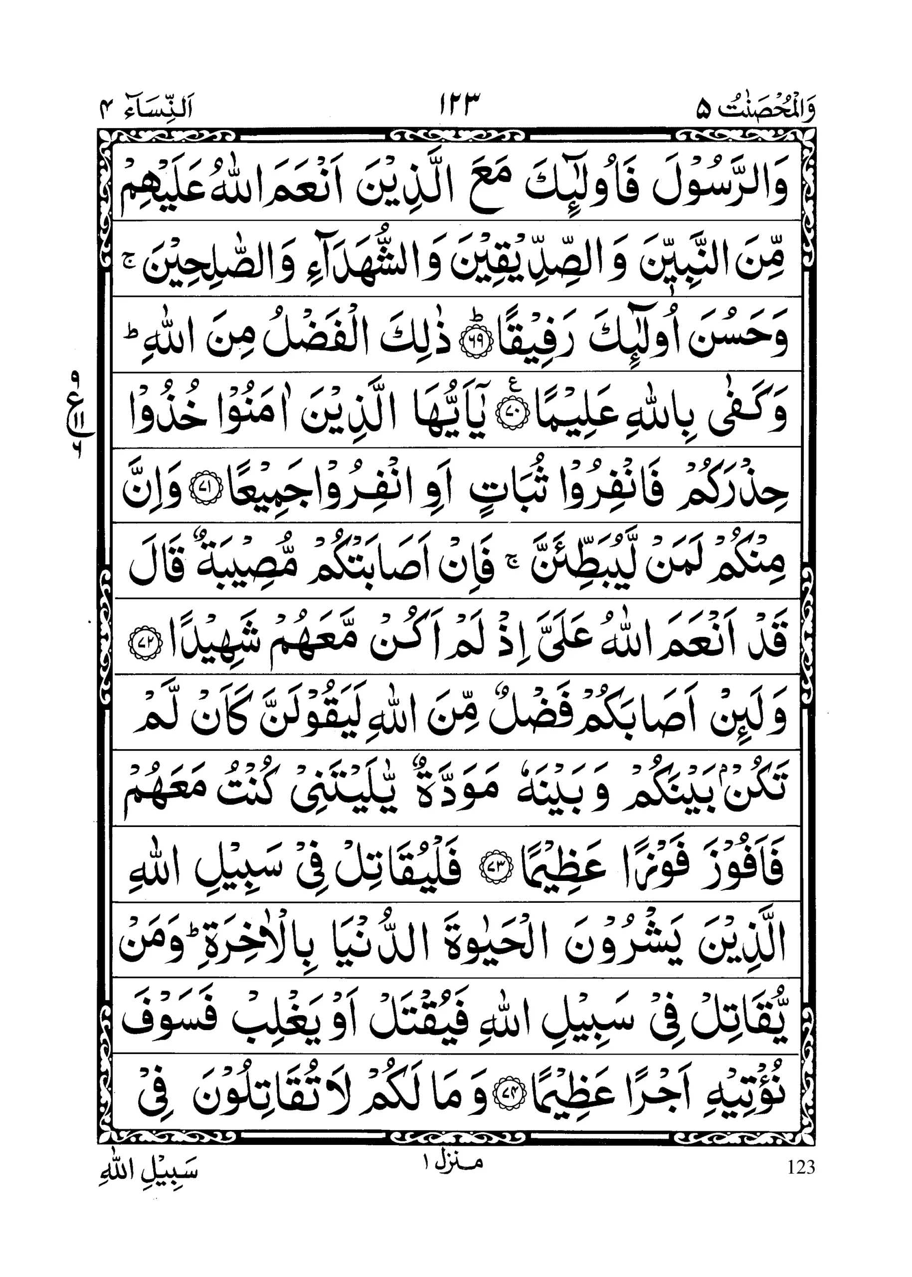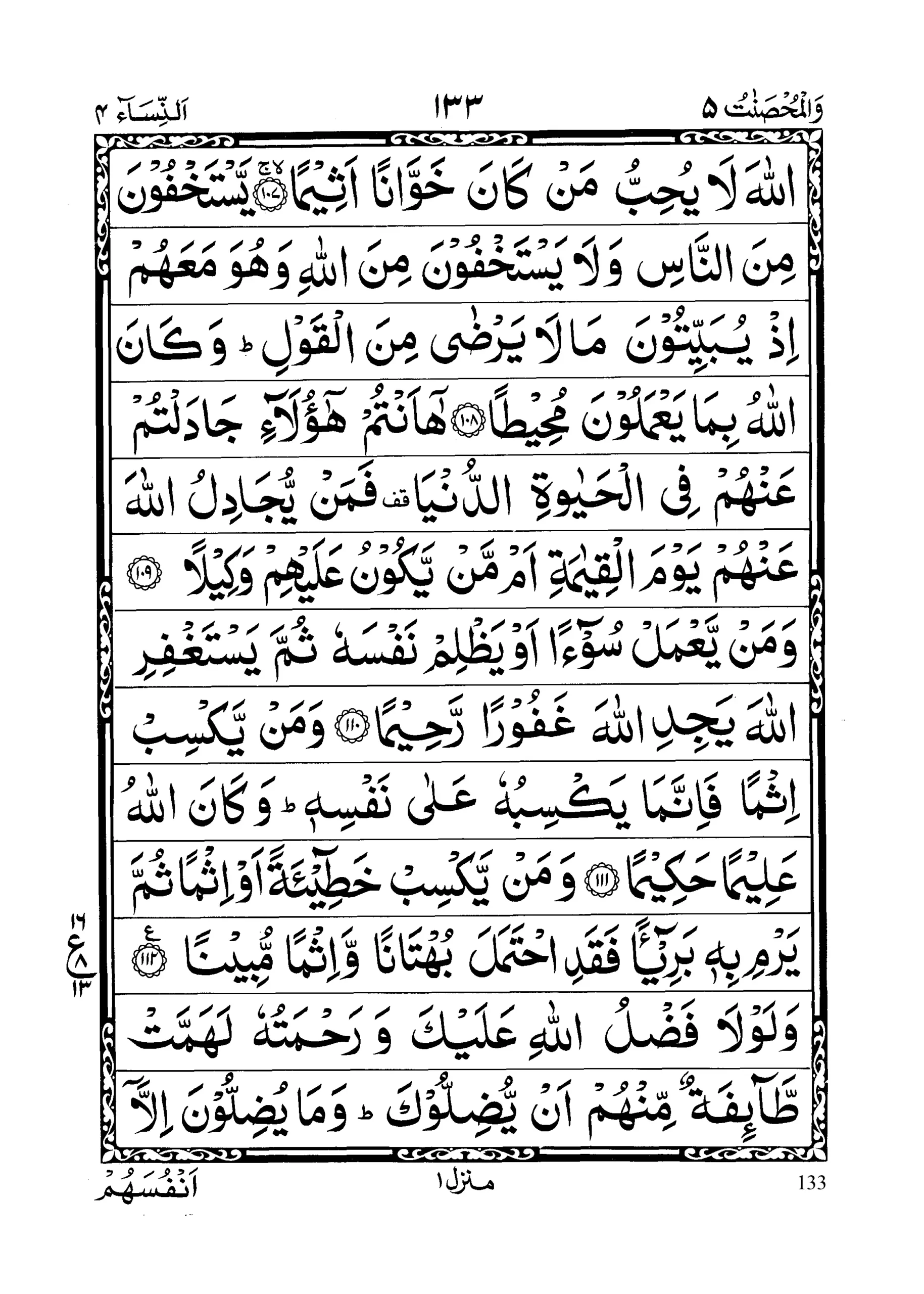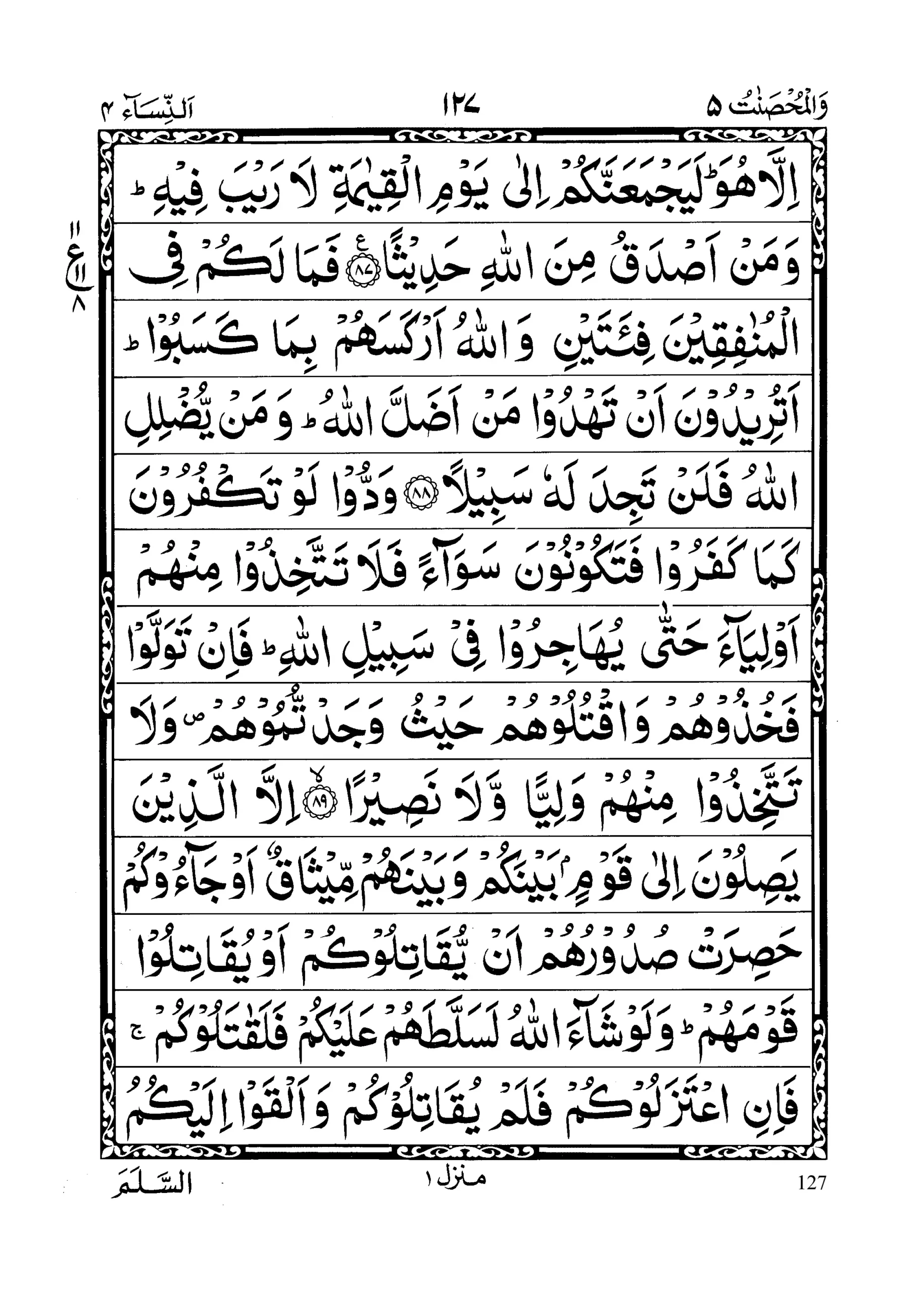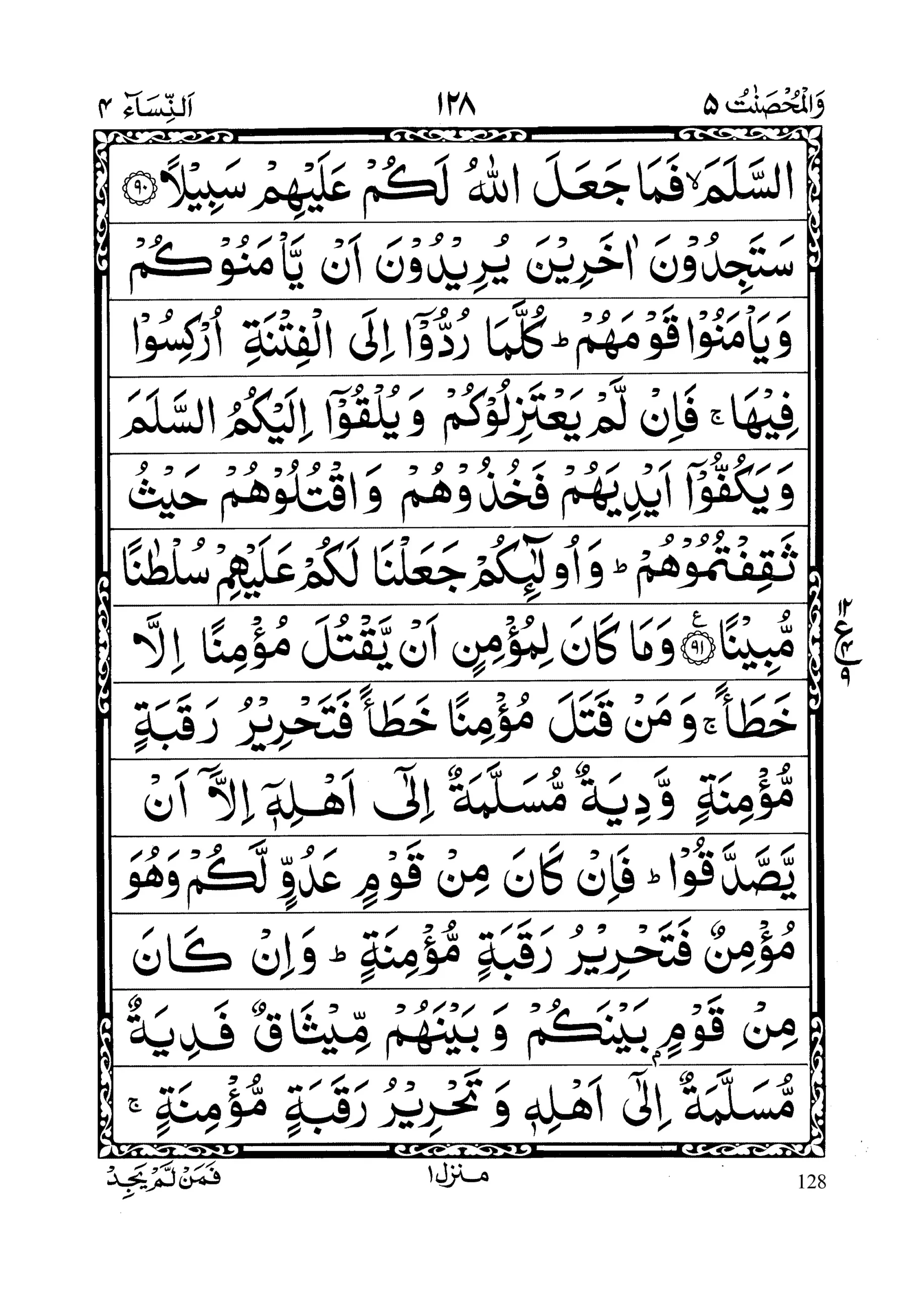 - Satajidoona aakhareena yureedoona ai ya’manookum wa ya’manoo qawmahum kullamaa ruddooo ilal fitnati urkisoo feehaa; fa il lam ya’tazilookum wa yulqooo ilai kumus salama wa yakuffooo aidiyahum fakhuzoohum waqtuloohum haisu saqif tumoohum; wa ulaaa’ikum ja’alnaa lakum ‘alaihim sultaanam mubeenaa (section 12)