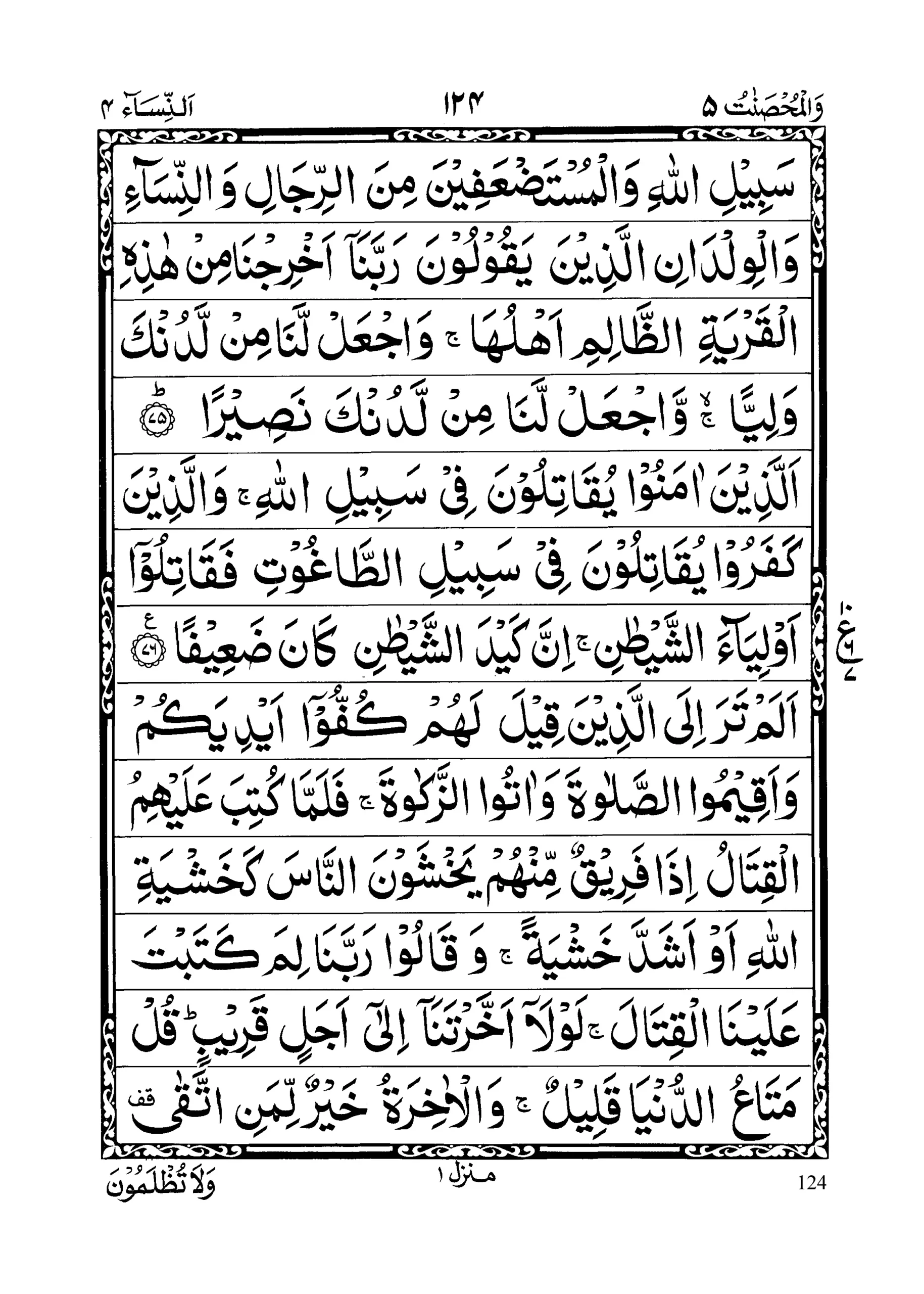 - Wa maa lakum laa tuqaatiloona fee sabeelil laahi walmustad’afeena minar rijaali wannisaaa’i walwildaanil lazeena yaqooloona Rabbanaaa akhrijnaa min haazihil qaryatiz zaalimi ahluhaa waj’al lanaa mil ladunka waliyanw waj’al lanaa mil ladunka naseeraa