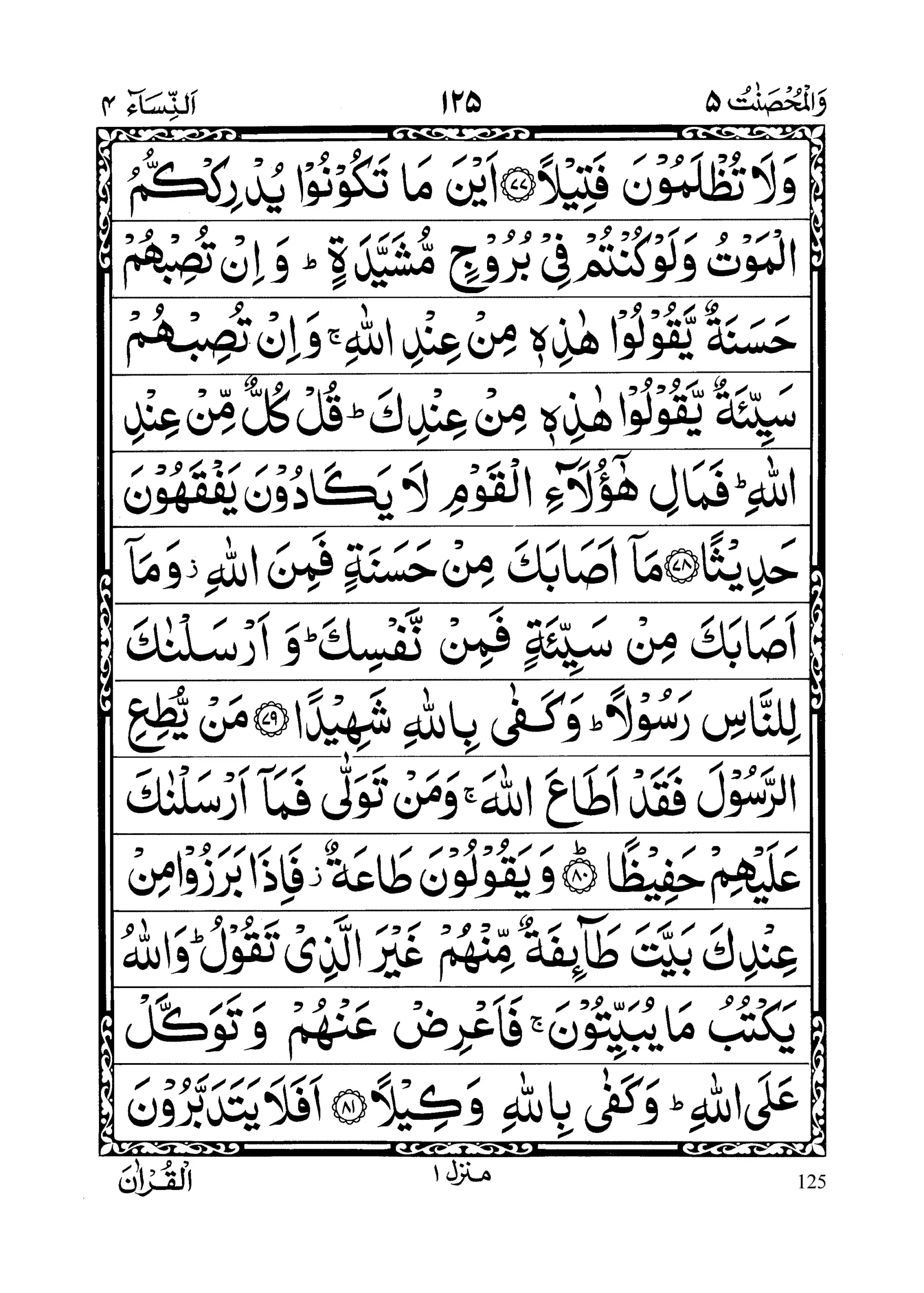 - Ayna maa takoonoo yudrikkumul mawtu wa law kuntum fee buroojim mushai yadah; wa in tusibhum hasanatuny yaqooloo haazihee min indil laahi wa in tusibhum saiyi’atuny yaqooloo haazihee min ‘indik; qul kullum min ‘indillaahi famaa lihaaa ‘ulaaa’il qawmi laa yakaadoona yafqahoona hadeesaa