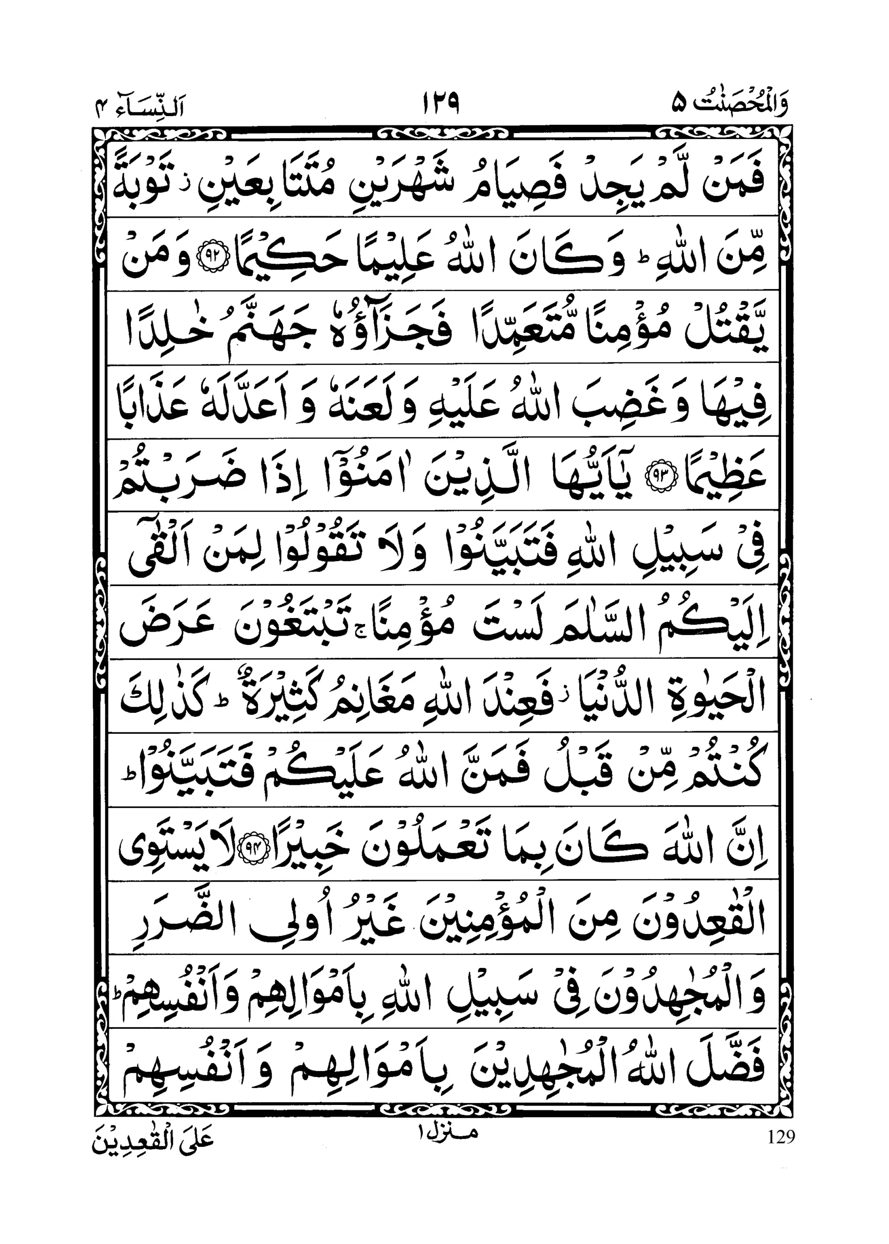- Wa maa kaana limu’minin ai yaqtula mu’minan illaa khata’aa; waman qatala mu’minan khata’an fa tahreeru raqabatim mu’minatinw wa diyatum musallamatun ilaaa ahliheee illaaa ai yassaddaqoo; fa in kaana min qawmin ‘aduwwil lakum wa huwa mu’minun fa tahreeru raqabatim mu’minah; wa in kaana min qawmim bainakum wa bainahum meesaaqun fadiyatum musallamatun ilaaa ahlihee wa tahreeru raqabatim mu’minah; famal lam yajid fa Siyaamu shahraini mutataabi’aini tawbatan minal laah; wa kaanal laahu ‘Aleeman hakeemaa