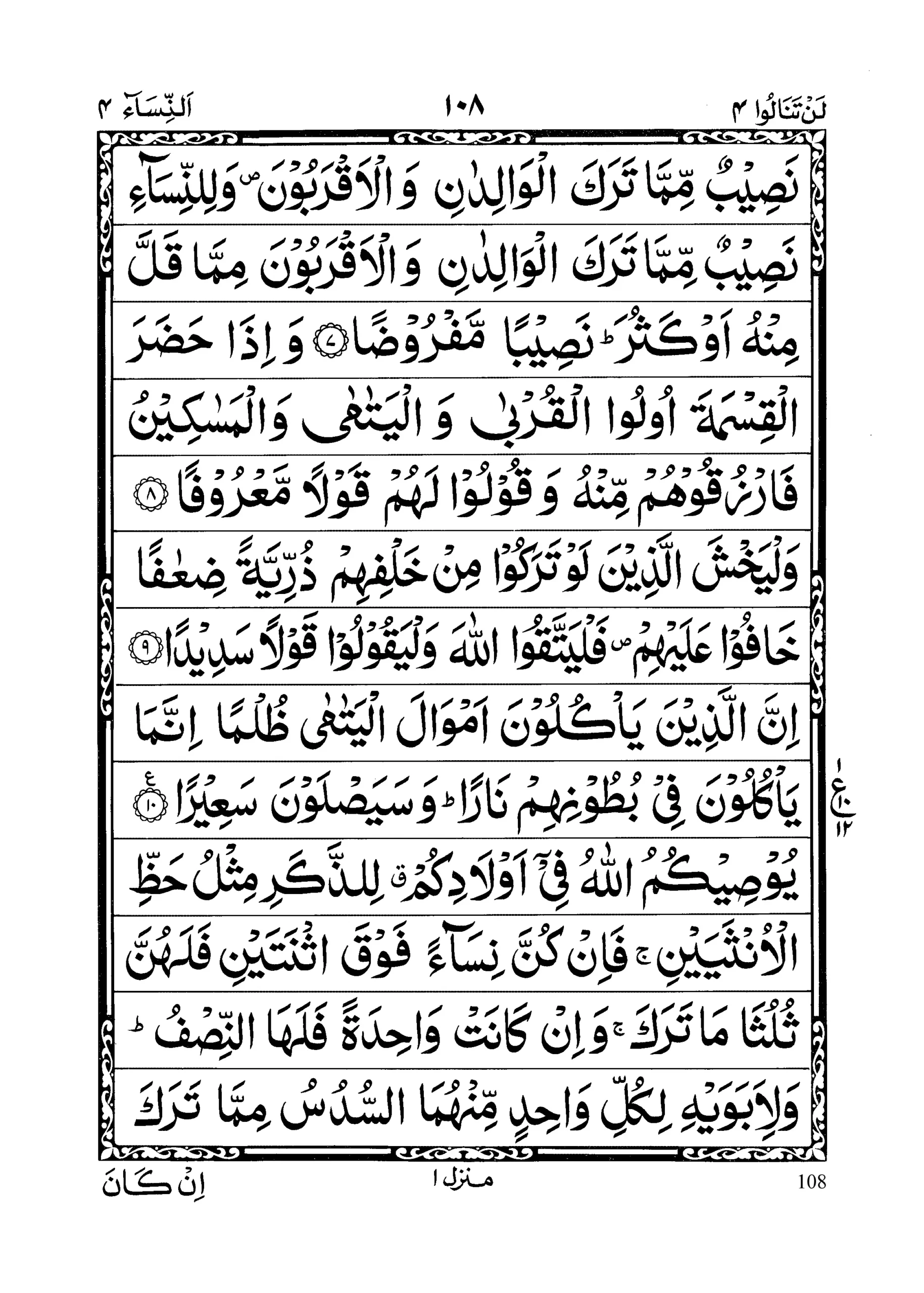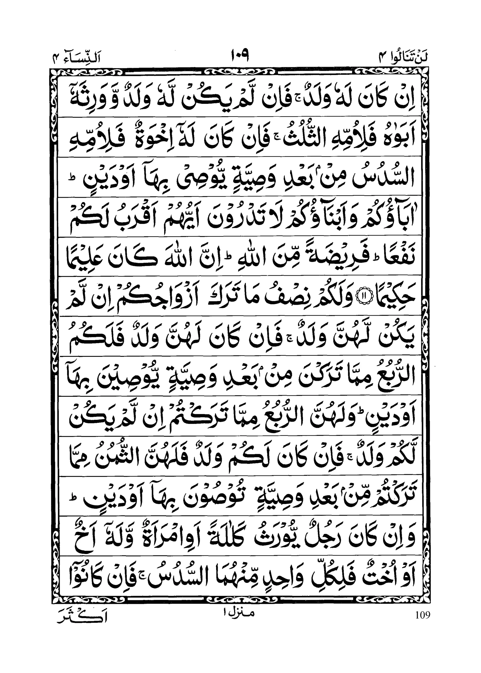 - Yooseekumul laahu feee awlaadikum liz zakari mislu hazzil unsayayn; fa in kunna nisaaa’an fawqas nataini falahunna sulusaa maa taraka wa in kaanat waahidatan falahan nisf; wa li abawaihi likulli waahidim minhumas sudusu mimmma taraka in kaana lahoo walad; fa il lam yakul lahoo waladunw wa warisahooo abawaahu fali ummihis sulus; fa in kaana lahoo ikhwatun fali ummihis sudus; mim ba’di wasiyyatiny yoosee bihaaa aw dayn; aabaaa’ukum wa abnaaa’ukum laa tadroona aiyuhum aqrabu lakum naf’aa; fareedatam minallaah; innal laaha kaana ‘Aleeman Hakeemaa