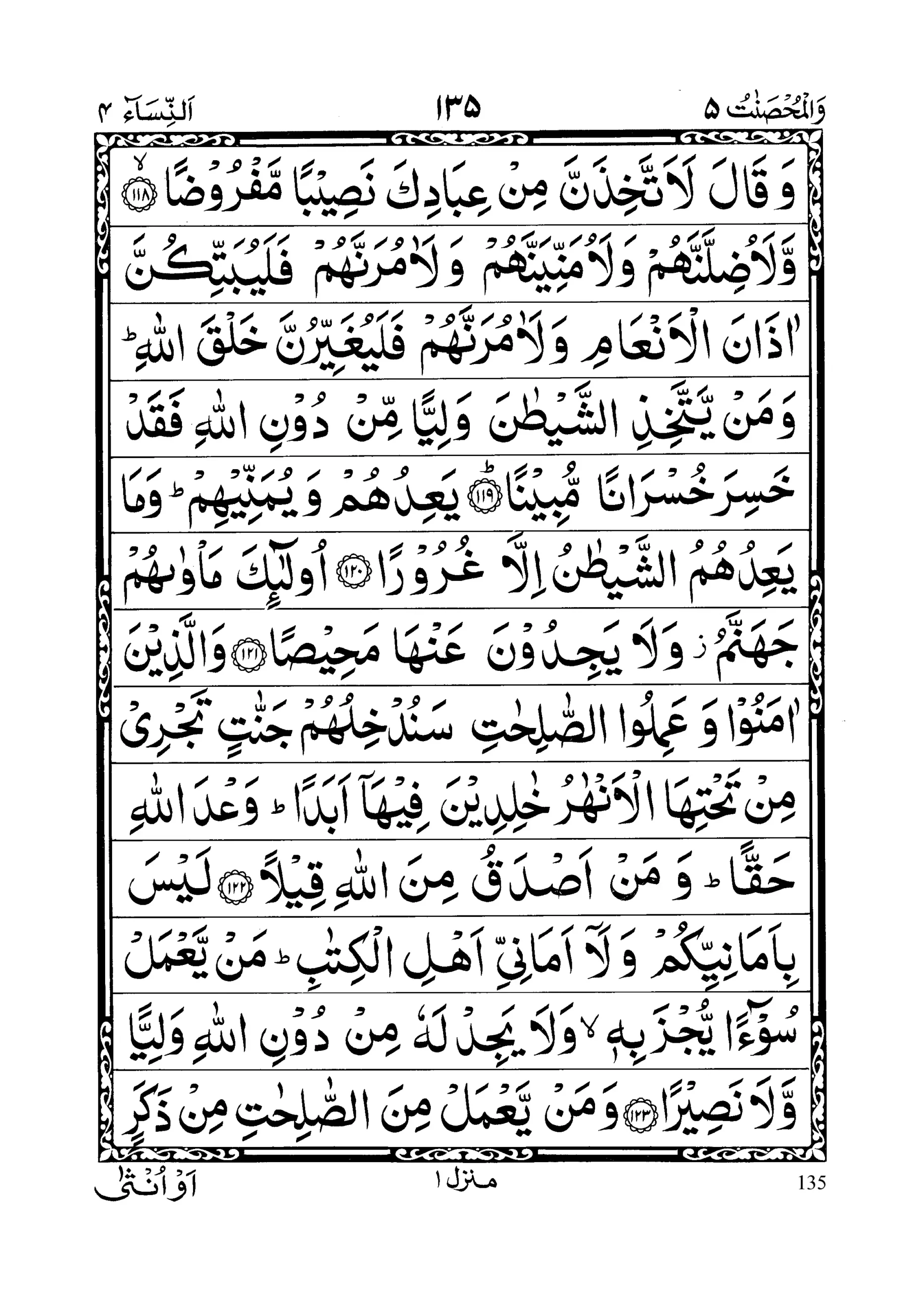- Wa la udillannahum wa la umanni yannnahum wa la aamurannahum fala yubat tikunna aazaanal an’aami wa la aamurannahum fala yughai yirunna khalqal laah; wa mai yattakhizish Shaitaana waliyyam min doonil laahi faqad khasira khusraanam mubeena