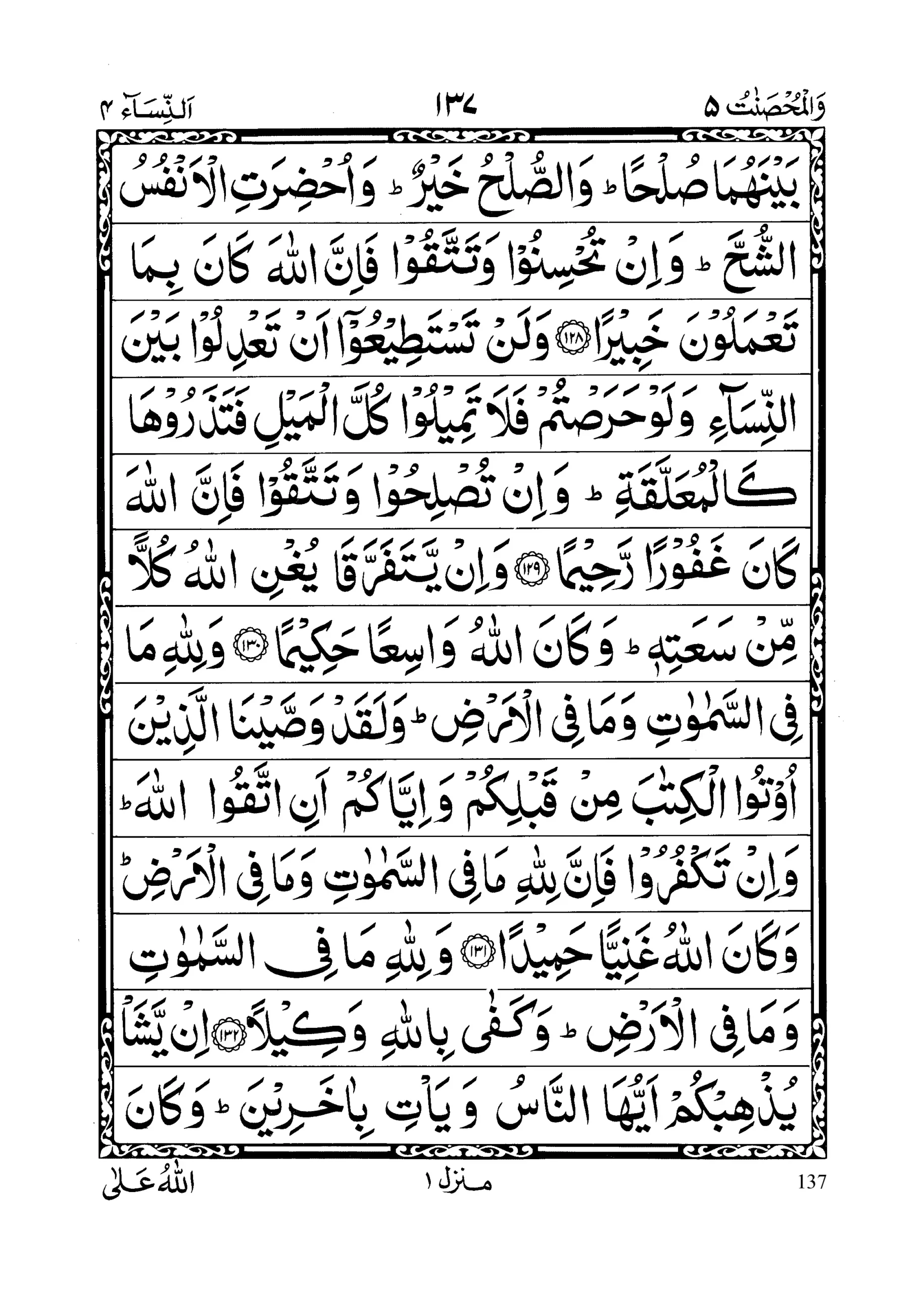 - Wa inimra atun khaafat mim ba’lihaa nushoozan aw i’raadan falaa junaaha ‘alaihi maaa ai yuslihaa bainahumaa sulhaa; wassulhu khair; wa uhdiratil anfusush shuhh; wa in tuhsinoo wa tattaqoo fa innal laaha kaana bimaa ta’maloona Khabeeraa