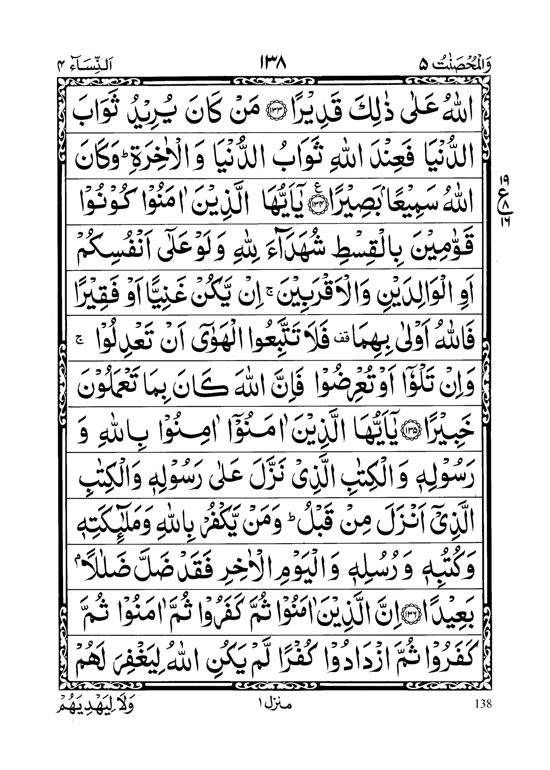 - Yaa aiyuhal lazeena aamanoo koonoo qawwa ameena bilqisti shuhadaaa’a lillaahi wa law ‘alaa anfusikum awil waalidaini wal aqrabeen iny yakun ghaniyyan aw faqeeran fallaahu awlaa bihimaa falaaa tattabi’ul hawaaa an ta’diloo; wa in talwooo aw tu’ridoo fa innal laaha kaana bimaa ta’maloona Khabeera