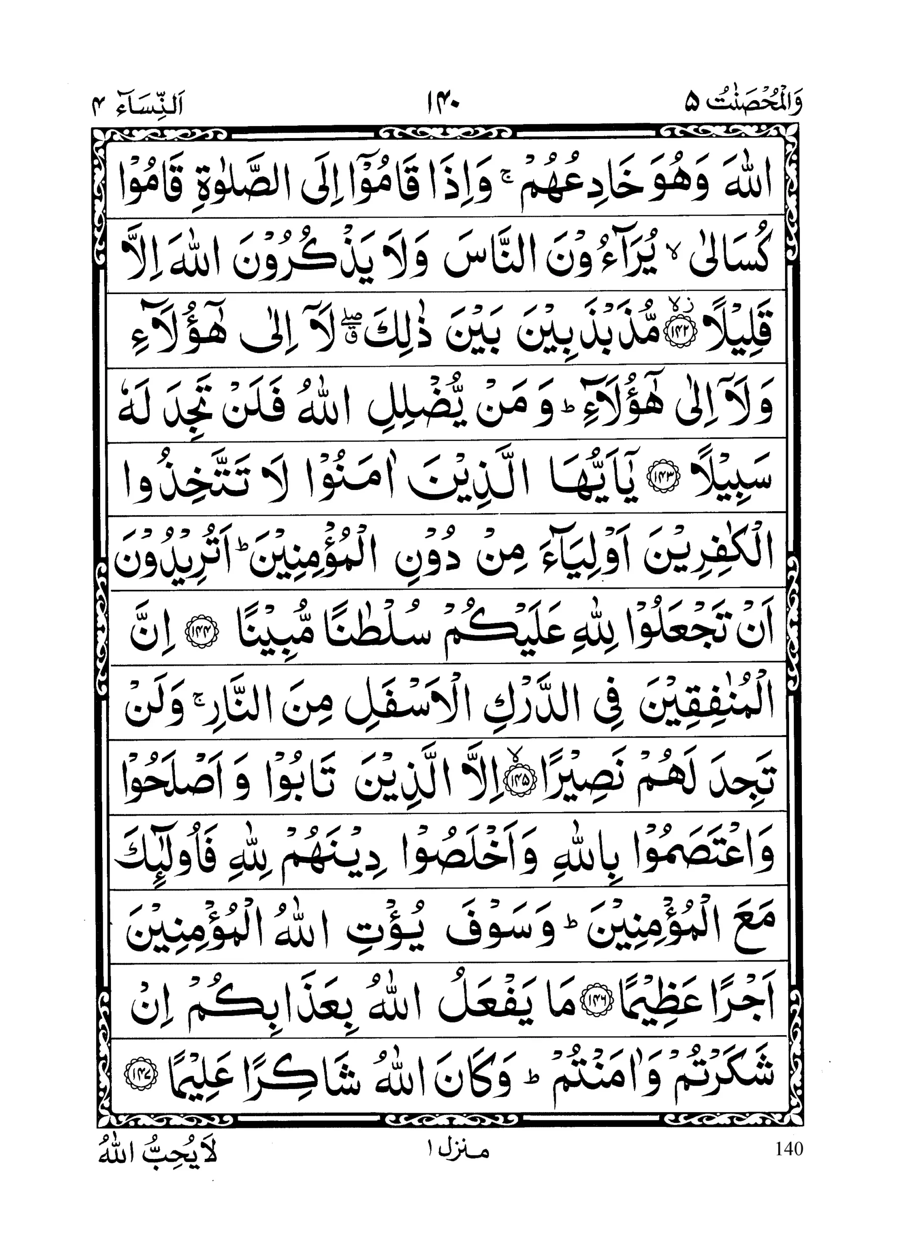 - Innal munaafiqeena yukhaadi’oonal laaha wa huwa khaadi’uhum wa izaa qaamooo ilas Salaati qaamoo kusaalaa yuraaa’oonan naasa wa laa yazkuroonal laaha illaa qaleelaa