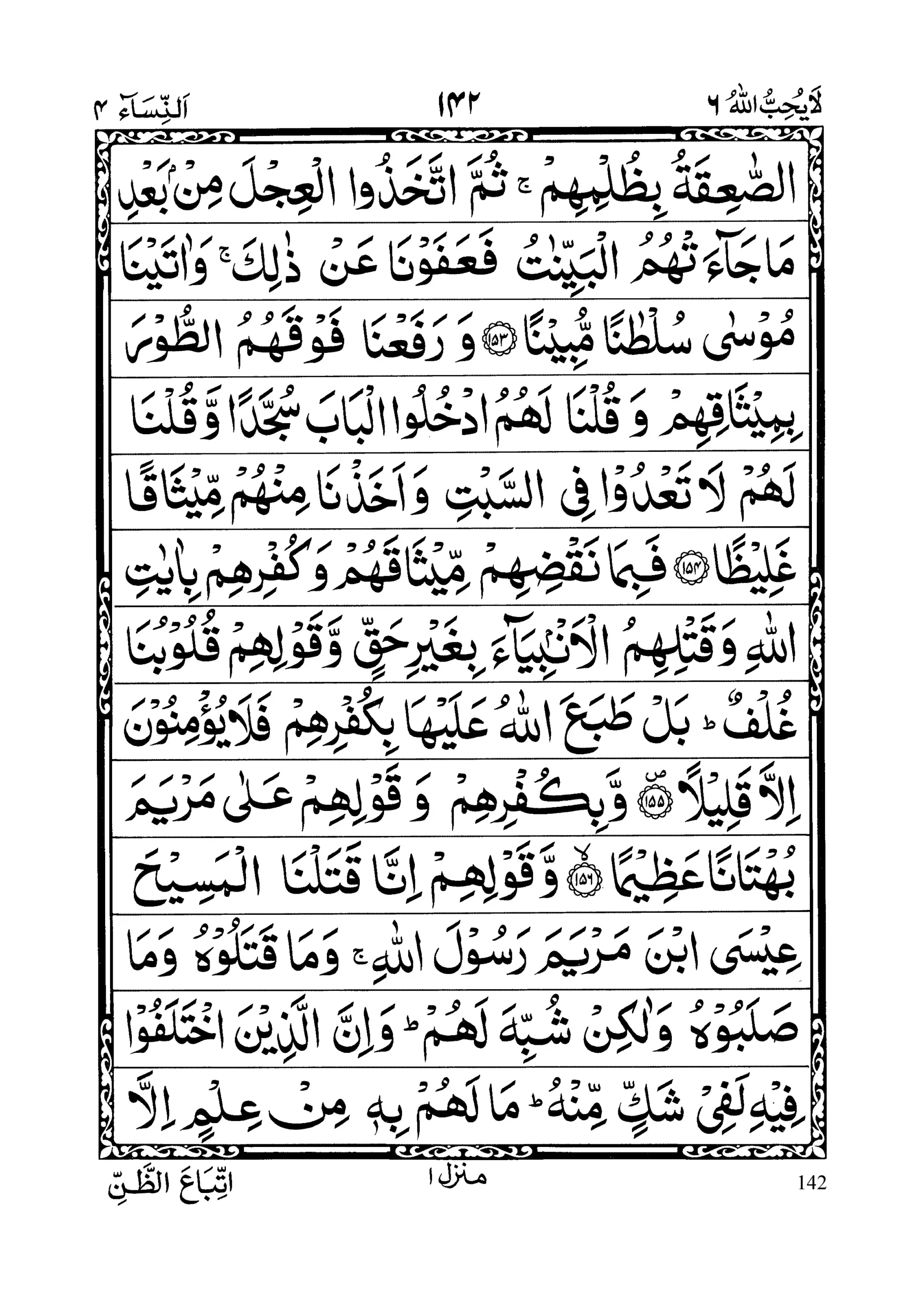 - yas’aluka Ahlul Kitaabi an tunazzila ‘alaihim Kitaabam minas samaaa’i faqad sa aloo Moosaa akbara min zaalika faqaaloo arinal laaha jahratan fa akhazat humus saa’iqatu bizulmihim; summat takhazul ‘ijla mim ba’di maa jaa’at humul baiyinaatu fa’afawnaa ‘ann zaalik; wa aatainaa Moosaa sultaanam mubeenaa