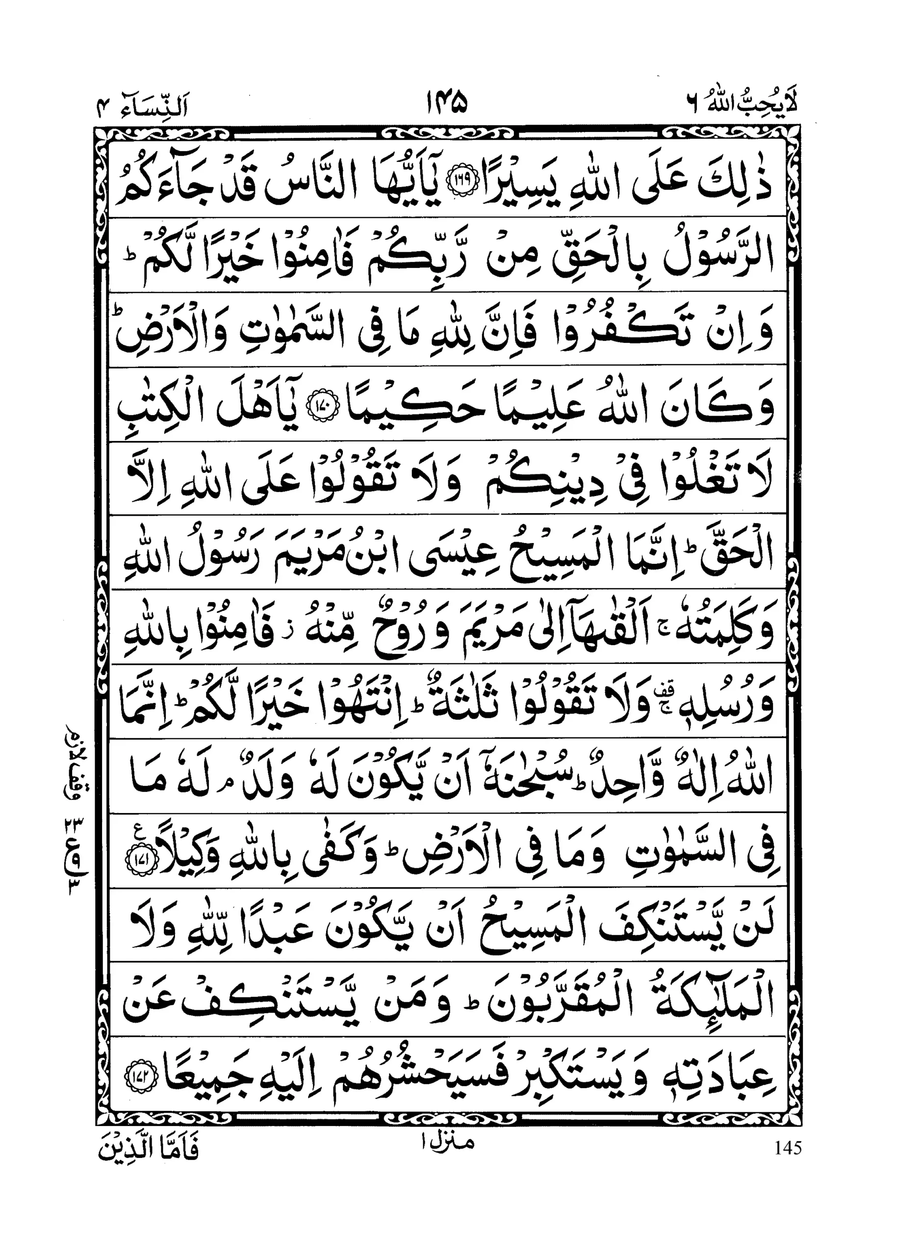 - Yaaa Ahlal Kitaabi laa taghloo fee deenikum wa laa taqooloo ‘alal laahi illalhaqq; innamal Maseehu ‘Eesab-nu-Maryama Rasoolul laahi wa Kalimatuhooo alqaahaaa ilaa Maryama wa roohum minhum fa aaminoo billaahi wa Rusulihee wa laa taqooloo salaasah; intahoo khairallakum; innamal laahu Ilaahunw Waahid, Subhaanahooo any yakoona lahoo walad; lahoo maa fissamaawaati wa maa fil ard; wa kafaa billaahi Wakeelaa (section 23)