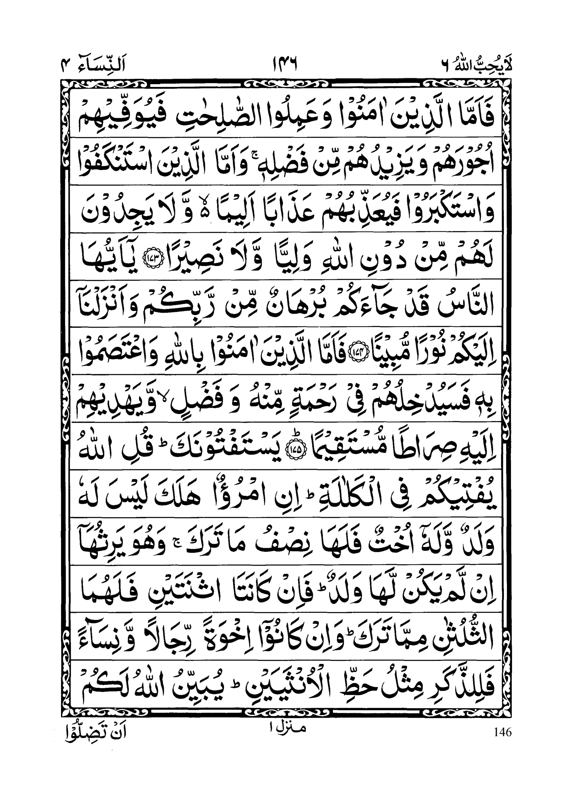 - Yastaftoonaka qulillaahu yafteekum fil kalaalah; inimru’un halaka laisa lahoo waladunw wa lahoo ukhtun falahaa nisfu maa tarak; wa huwa yarisuhaaa il lam yakkul lahaa walad; fa in kaanatas nataini falahumas sulusaani mimmmaa tarak; wa in kaanooo ikhwatar rijaalanw wa nisaaa’an faliz zakari mislu hazzil unsayayn; yubaiyinullaahu lakum an tadilloo; wallaahu bikulli shai’in Aleem (section 24)