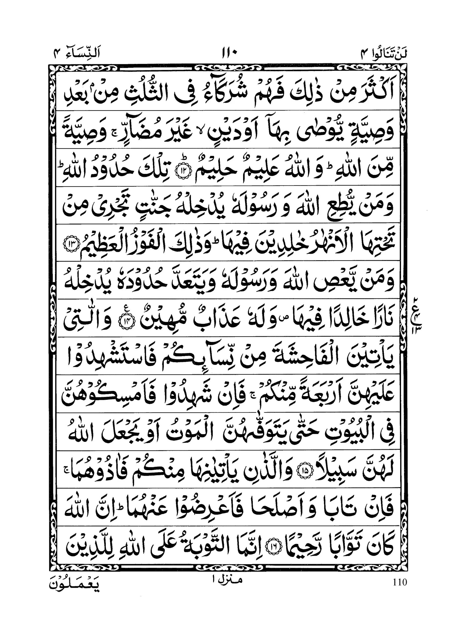 - Wa lakum nisfu maa taraka azwaajukum il lam yakul lahunna walad; fa in kaana lahunna waladun falakumur rub’u mimmaa tarakna mim ba’di wasiyyatiny yooseena bihaaa aw dayn; wa lahunnar rubu’u mimmaa taraktum il lam yakul lakum walad; fa in kaana lakum waladun falahunnas sumunu mimmaa taraktum; mim ba’di wasiyyatin toosoona bihaaa aw dayn; wa in kaana rajuluny yoorasu kalaalatan awim ra atunw wa lahooo akhun aw ukhtun falikulli waahidim minhumas sudus; fa in kaanooo aksara min zaalika fahum shurakaaa’u fissulus; mim ba’di wasiyyatiny yoosaa bihaaa aw dainin ghaira mudaaarr; wasiyyatam minal laah; wallaahu ‘Aleemun Haleem