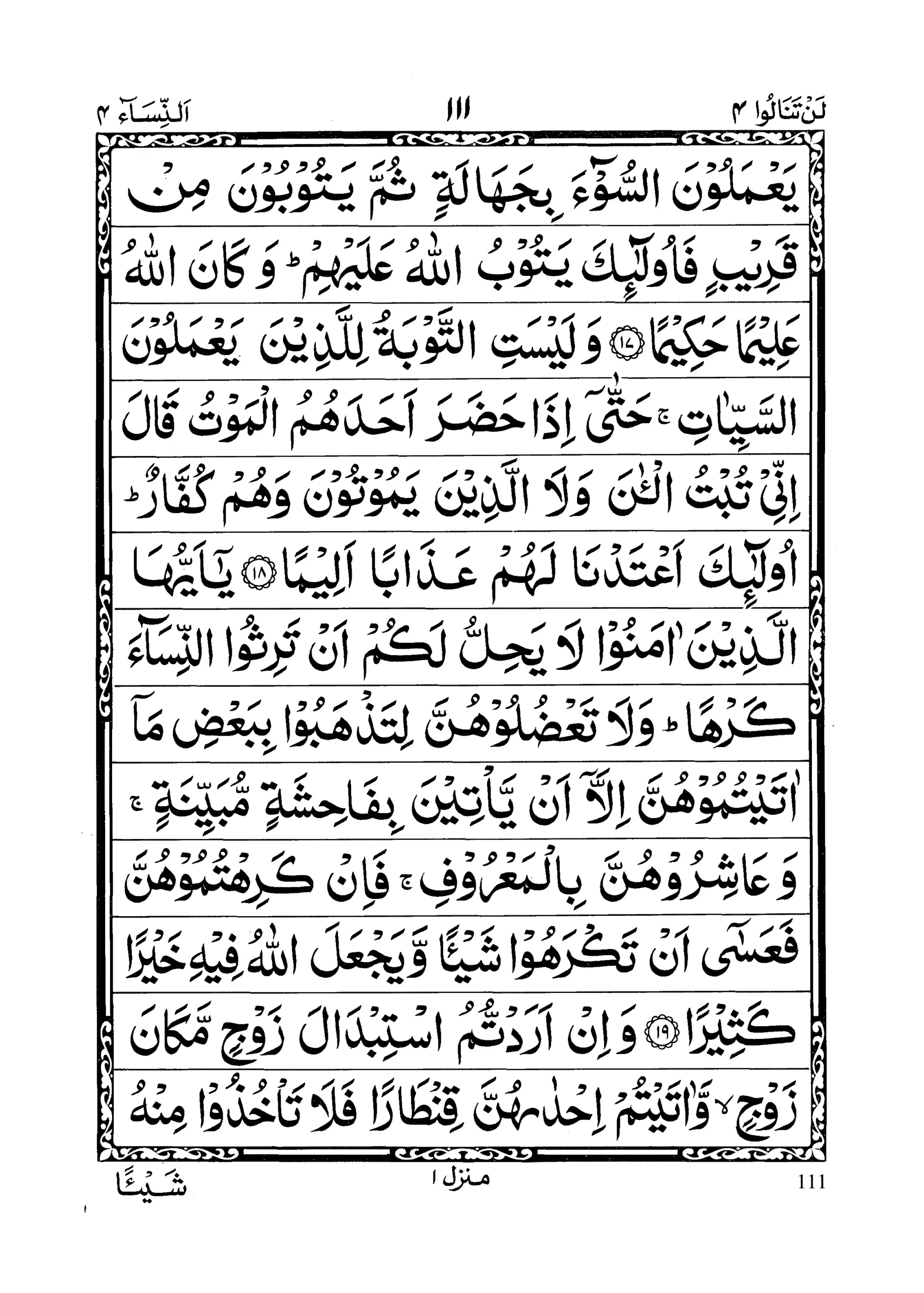 - Yaaa aiyuhal lazeena aamanoo laa yahillu lakum an tarisun nisaaa’a karhan wa laa ta’duloohunna litazhaboo biba’di maaa aataitumoohunna illaaa ai ya’teena bifaahishatim mubaiyinah; wa ‘aashiroo hunna bilma’roof; fa in karihtumoohunna fa’asaaa an takrahoo shai’anw wa yaj’alal laahu feehi khairan kaseeraa