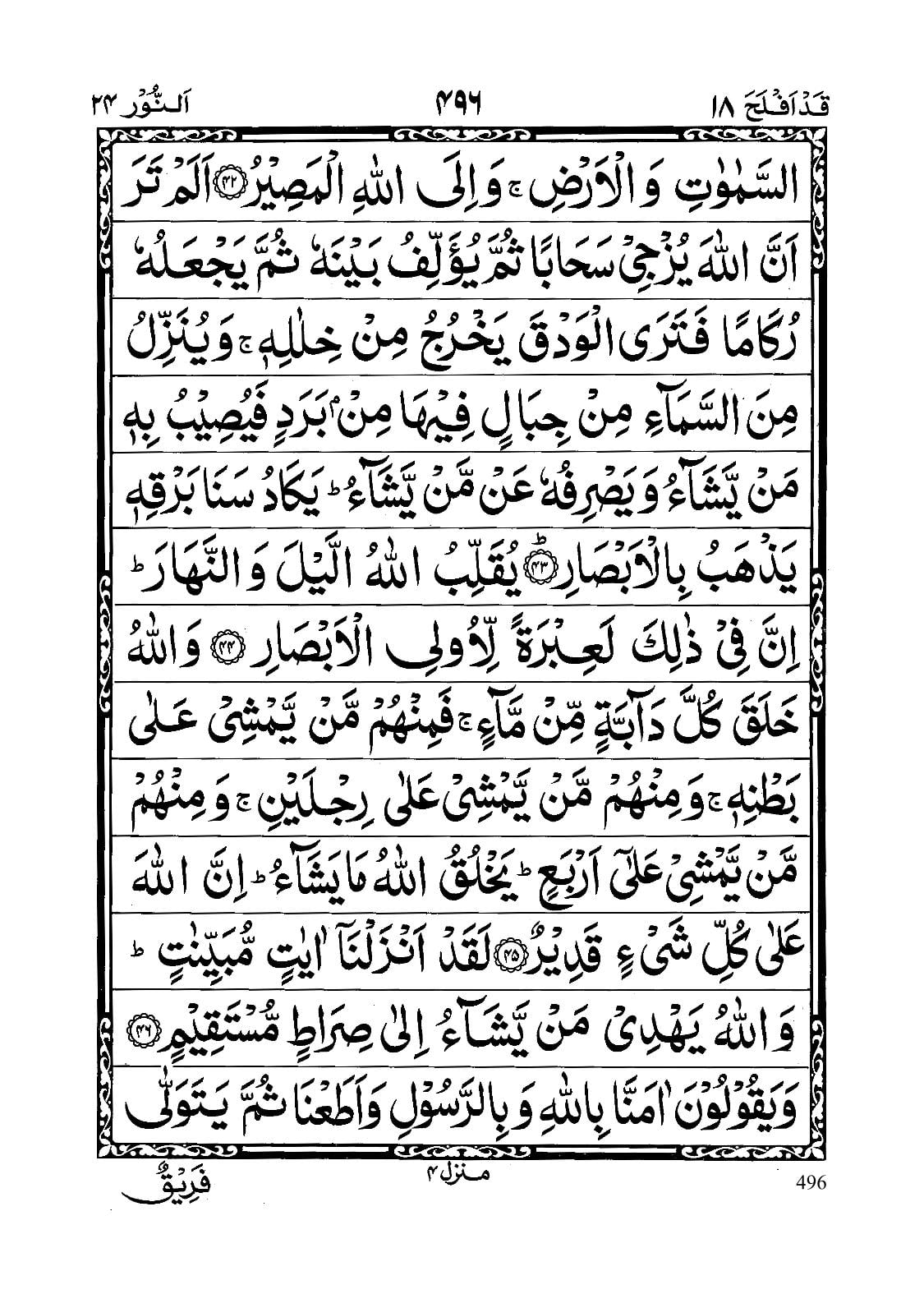 - Alam tara annal laaha yuzjee sahaaban summa yu’allifu bainahoo summa yaj’aluhoo rukaaman fataral wadqa yakhruju min khilaalihee wa yunazzilu minas samaaa’i min jibaalin feehaa mim baradin fa yuseebu bihee mai yashaaa’u wa yasrifuhoo ‘am mai yashaaa’u yakkaadu sanaa barqihee yazhabu bil absaar