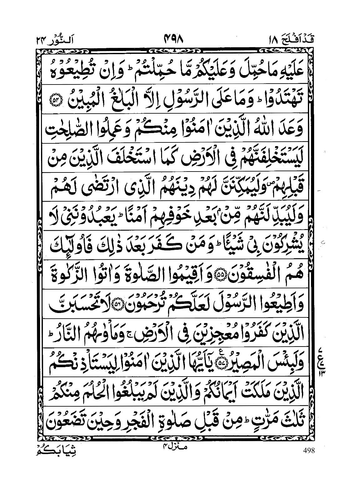 - Wa’adal laahul lazeena aamanoo minkum wa ‘amilus saalihaati la yastakhlifan nahum fil ardi kamastakh lafal lazeena min qablihim wa la yumakkinanna lahum deenahumul lazir tadaa lahum wa la yubaddilannahum mim ba’di khawfihim amnaa; ya’budoonanee laayushrikoona bee shai’aa; wa man kafara ba’da zaalika fa ulaaa’ika humul faasiqoon