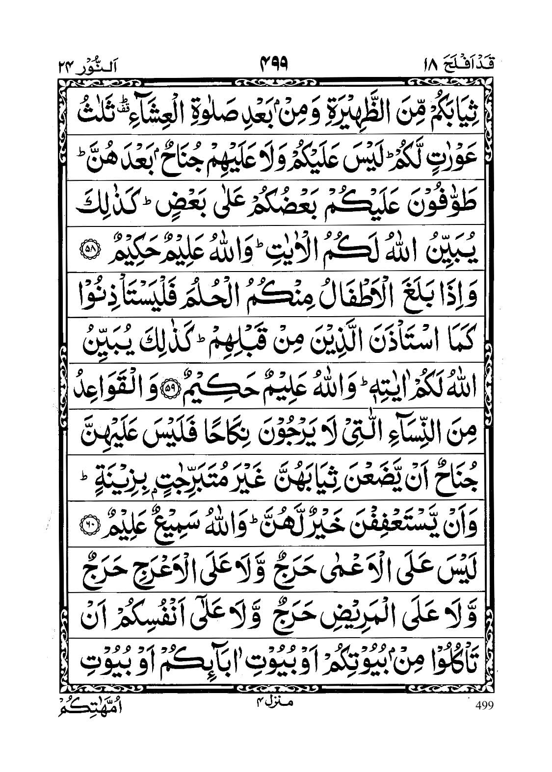 - Yaaa aiyuhal lazeena aamanoo li yasta’zinkumul lazeena malakat aimaanukum wallazeena lam yablughul huluma minkum salaasa marraat; min qabli Salaatil Fajri wa heena tada’oona siyaa bakum minaz zaheerati wa min ba’di Salaatil Ishaaa’; salaasu ‘awraatil lakum; laisa ‘alaikum wa laa ‘alaihim junaahun ba’dahunn; tawwaafoona ‘alaikum ba’dukum ‘alaa ba’d; kazaalika yubaiyinul laahu lakumul aayaat; wallahu ‘Aleemun Hakeem