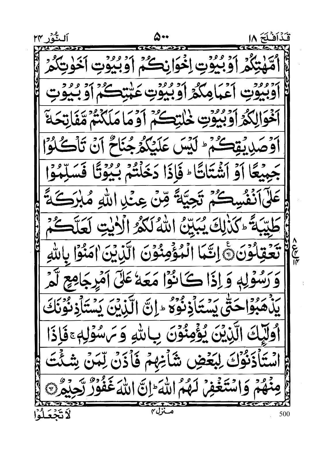 - Laisa ‘alal a’maa harajunw wa laa ‘alal a’raji harajunw wa laa ‘alal mareedi harajun wa laa ‘alaa anfusikum ‘an ta’kuloo min buyootikum aw buyooti aabaaa’ikum aw buyooti ummahaatikum aw buyooti ikhwaanikum aw buyooti akhawaatikum aw buyooti a’maamikum aw buyooti ‘ammaatikum aw buyooti akhwaalikum aw buyooti khaalaatikum aw maa malaktum mafaatihahooo aw sadeeqikum; laisa ‘alaikum junaahun ‘an ta’kuloo jamee’an aw ashtaata; fa izaa dakhaltum buyootan fa sallimoo ‘alaaa anfusikum tahiyyatan min ‘indil laahi mubaarakatan taiyibah; kazaalika yubai yinul laahu lakumul Aayaati la’allakum ta’qiloon (section 8)