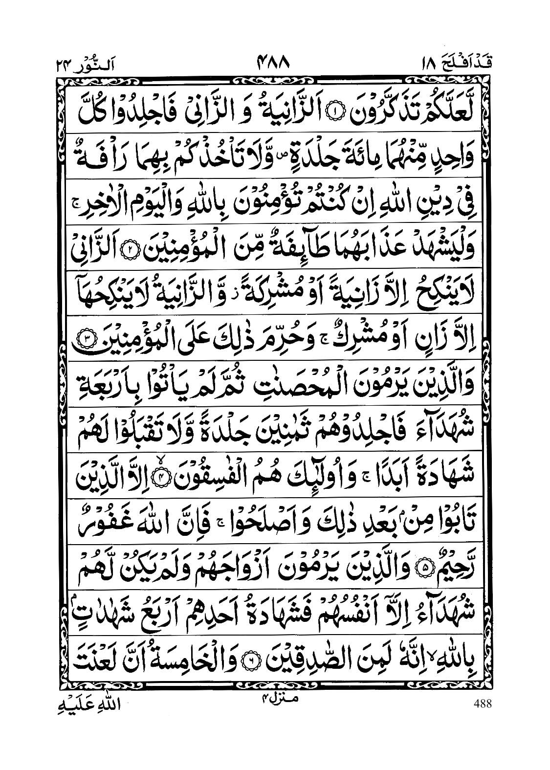 - Azzaaniyatu wazzaanee fajlidoo kulla waahidim minhumaa mi’ata jaldatinw wa laa taakhuzkum bihimaa raafatun fee deenil laahi in kuntum tu’minoona billaahi wal Yawmil Aakhiri wal yashhad ‘azaabahumaa taaa’ifatum minal mu’mineen