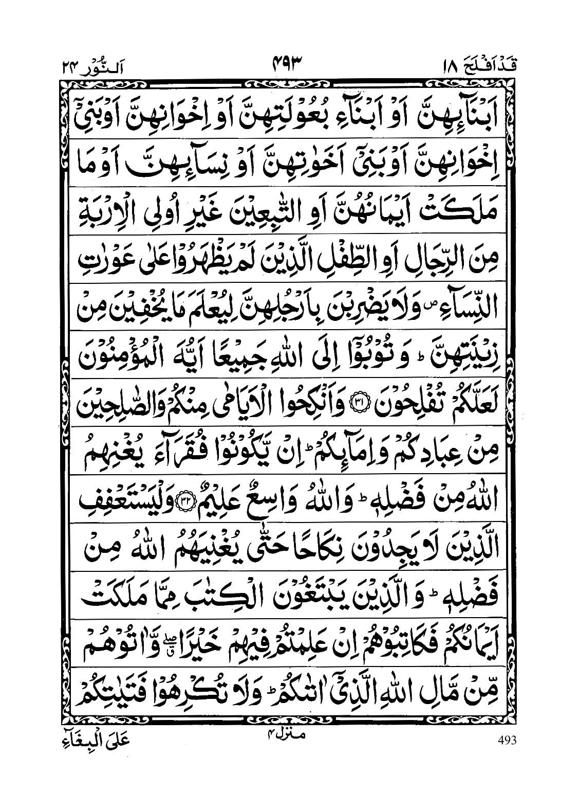 - Wa qul lilmu’minaati yaghdudna min absaarihinna wa yahfazna furoojahunna wa laa yubdeena zeenatahunna illaa maa zahara minhaa wala yadribanna bikhumurihinna ‘alaa juyoobihinna wa laa yubdeena zeenatahunna illaa libu’oolatihinna aw aabaaa’i hinna aw aabaaa’i bu’oolati hinna aw abnaaa’ihinnaa aw abnaaa’i bu’oolatihinnna aw ikhwaanihinnna aw baneee ikhwaanihinna aw banee akhawaatihinna aw nisaaa’i hinna aw maa malakat aimaanuhunna awit taabi’eena ghairi ilil irbati minar rijaali awit tiflillazeena lam yazharoo ‘alaa ‘awraatin nisaaa’i wala yadribnna bi arjulihinna liyu’lama maa yukhfeena min zeenatihinn; wa toobooo ilallaahi jammee’an aiyuhal mu’minoona la’allakum tuflihoon