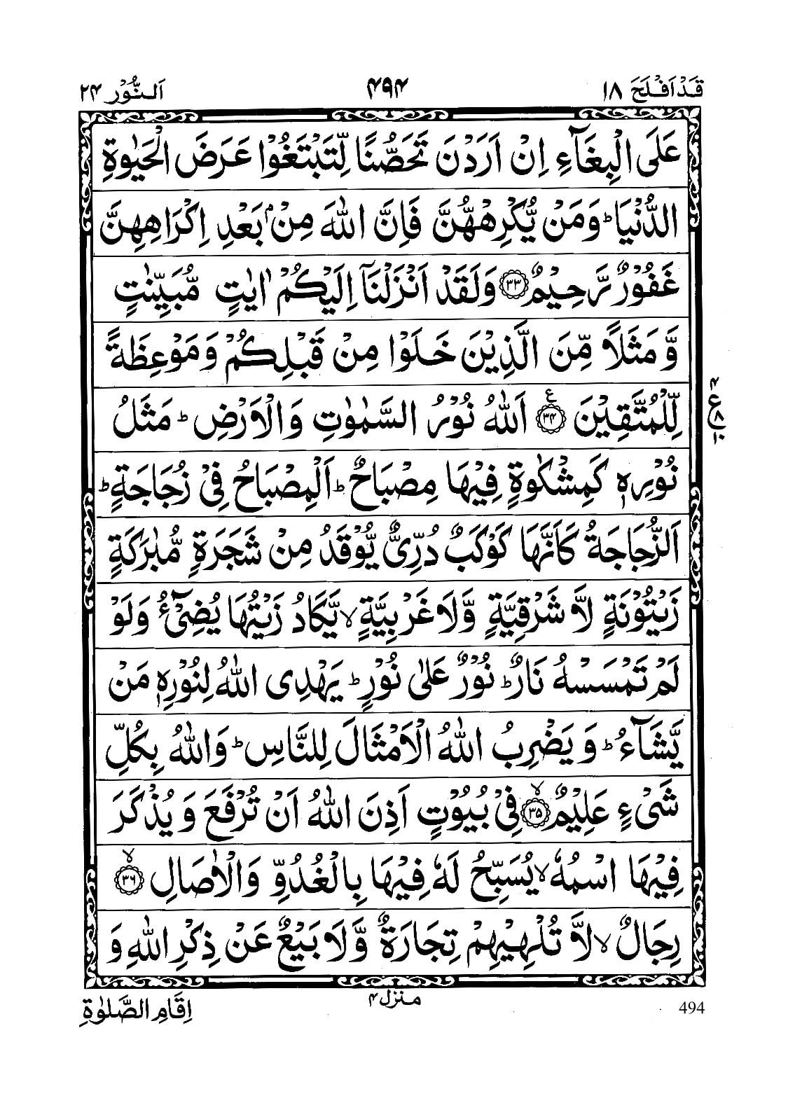 - Wal yasta’fifil lazeena laa yajidoona nikaahan hatta yughniyahumul laahu min fadlih; wallazeena yabtaghoonal kitaaba mimmaa malakat aimaanukum fakaatiboohum in ‘alimtum feehim khairanw wa aatoohum mimmaalil laahil lazeee aataakum; wa laa tukrihoo fatayaatikum ‘alal bighaaa’i in aradna tahassunal litabtaghoo ‘aradal hayaatid dunyaa; wa mai yukrihhunna fa innal laaha mim ba’di ikraahihinna Ghafoorur Raheem