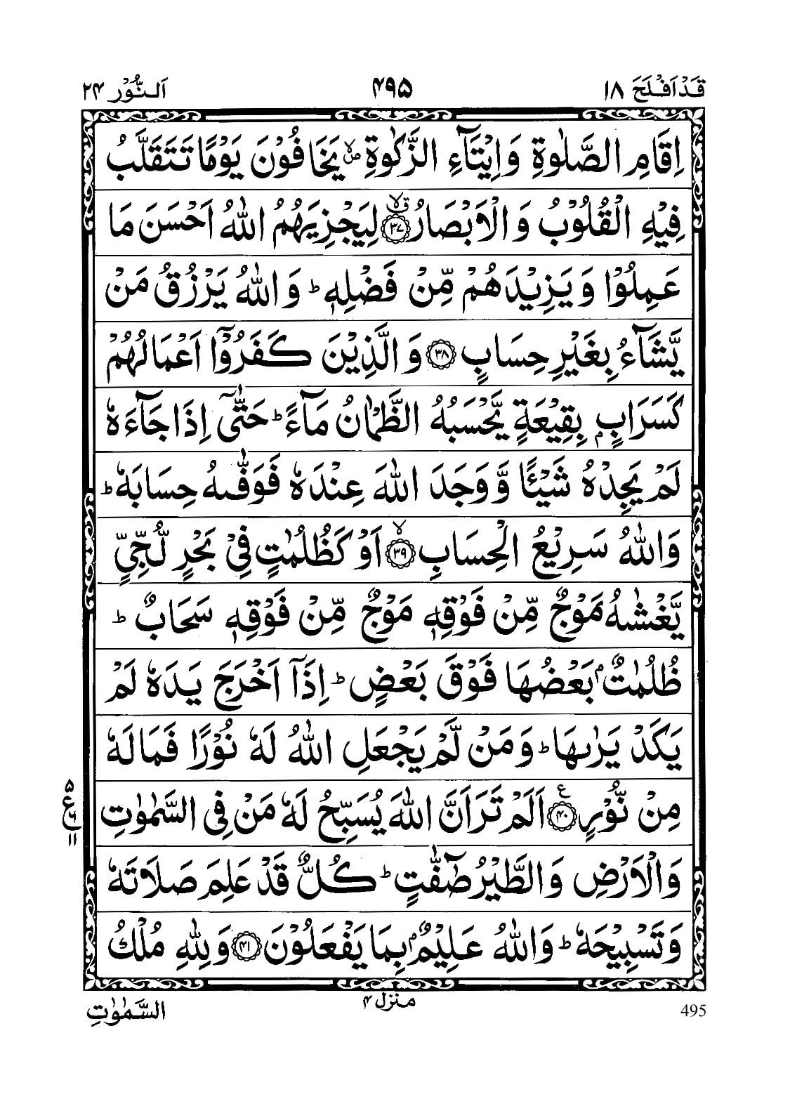 - Aw kazulumaatin fee bahril lujjiyyiny yaghshaahu mawjun min fawqihee mawjun min fawqihee sahaab; zulumatun ba’duhaa fawqa ba’din izaaa akhraja yadahoo lam yakad yaraahaa wa man lam yaj’alil laahu lahoo nooran famaa lahoo min noor (section 5)