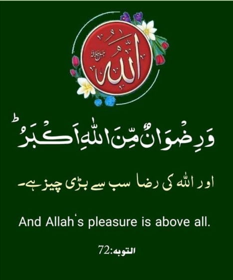 - Wa’adal laahulmu’ mineena walmu’minaati Jannaatin tajree min tahtihal anhaaru khaalideena feehaa wa masaakina taiyibatan fee Jannnaati ‘adn; wa ridwaanum minal laahi akbar; zaalika huwal fawzul ‘azeem (section 9)