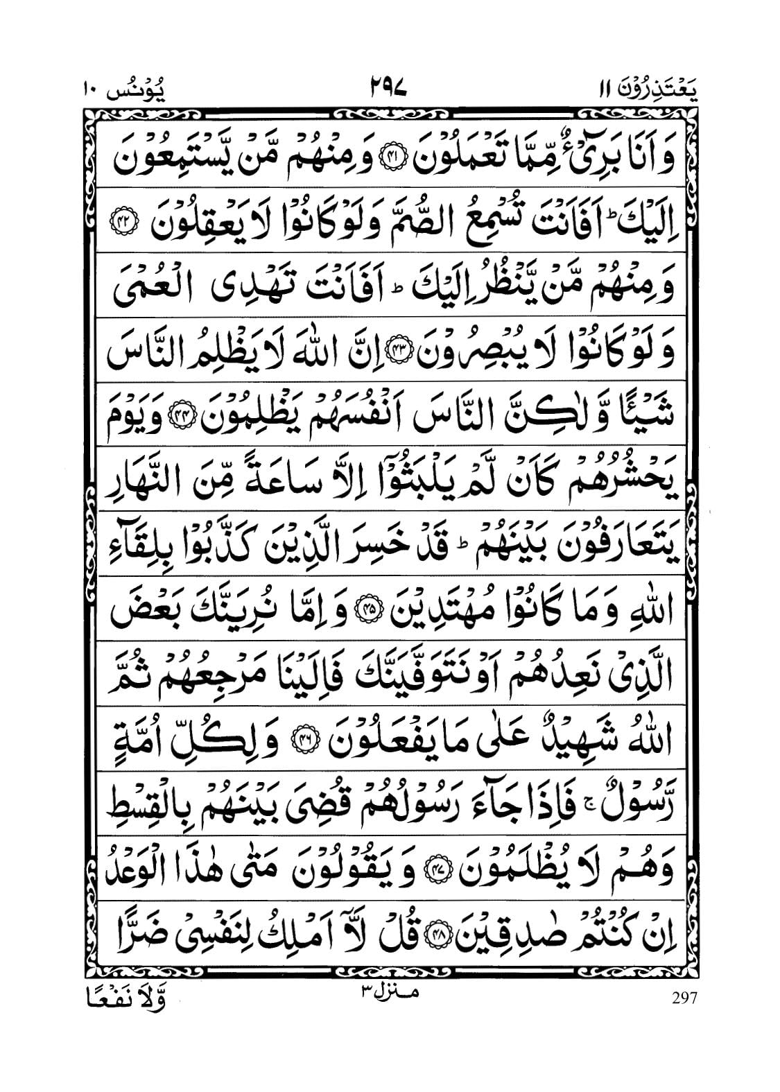 - Wa izaa tutlaa ‘alaihim aayaatunaa baiyinaatin qaalal lazeena laa yarjoona liqaaa’a na’ti bi Qur’aanin ghairi haazaaa aw baddilh; qul maa yakoonu leee ‘an ‘ubaddilahoo min tilqaaa’i nafsee in attabi’u illaa maa yoohaaa ilaiya inneee akhaafu in ‘asaytu Rabbee ‘azaaba Yawmin ‘Azeem