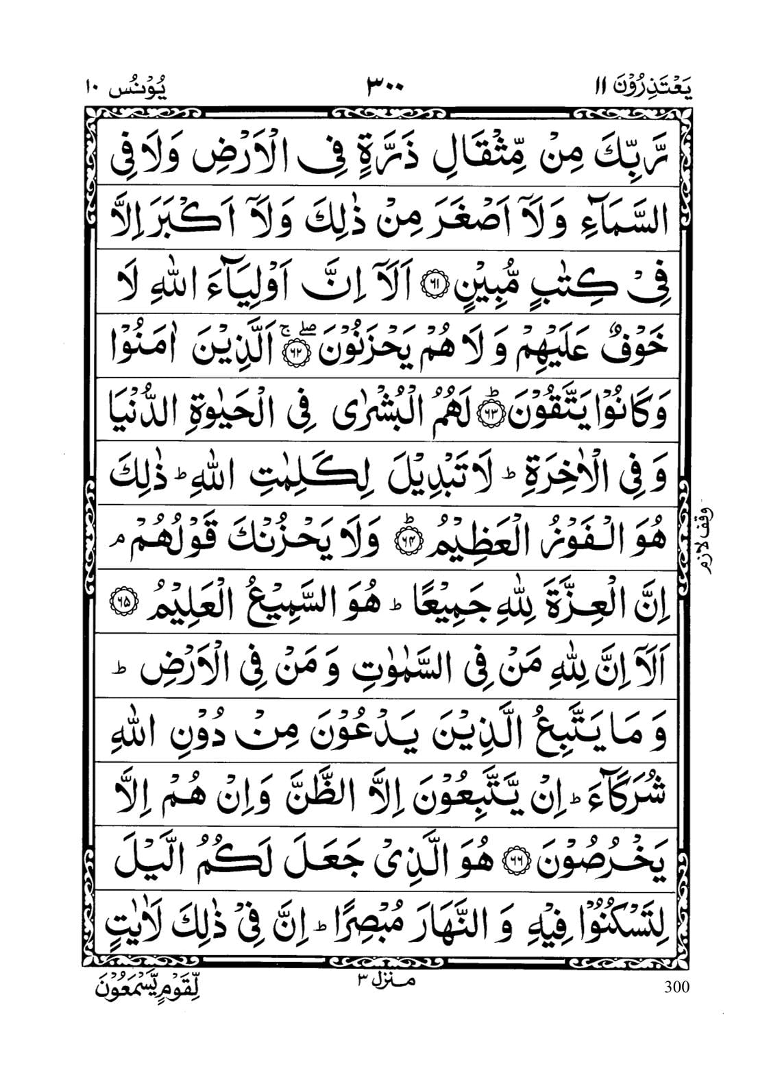 - Wa maa takoonu fee sha’ninw wa maa tatloo minhu min qur’aaninw wa laa ta’maloona min ‘amalin illaa kunnaa ‘alaikum shuhoodan iz tufeedoona feeh; wa maa ya’zubu ‘ar Rabbika min misqaali zarratin fil ardi wa laa fis samaaa’i wa laaa asghara min zaalika wa laaa akbara illaa fee Kitaabin Mubeen