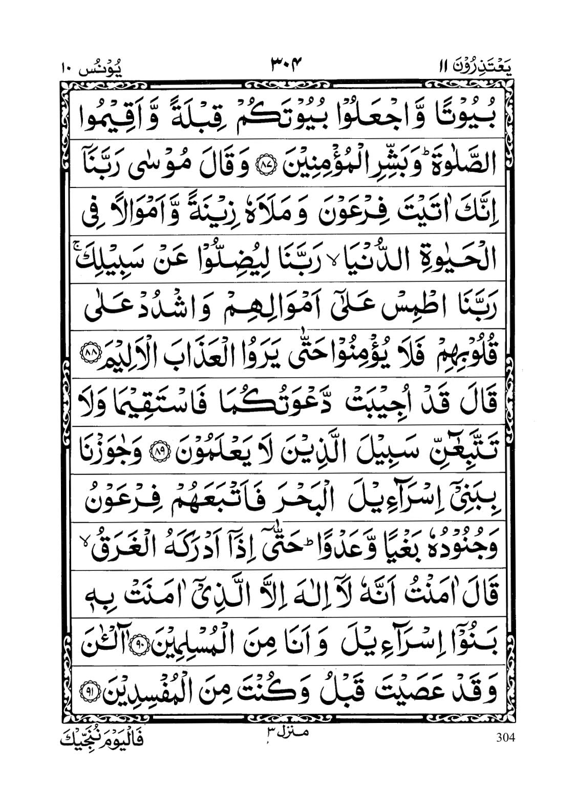 - Wa jaawaznaa bi Baneee Israaa’eelal bahra fa atba’ahum Fir’awnu wa junooduhoo baghyanw wa ‘adwaa; hattaaa izaaa adrakahul gharaqu qaala aamantu annahoo laaa ilaaha illal lazeee aamanat bihee Banooo Israaa’eela wa ana minal muslimeen