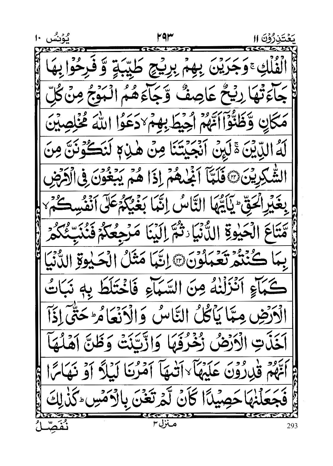 - Huwal lazee yusayyirukum fil barri walbahri hattaaa izaa kuntum fil fulki wa jaraina bihim bi reehin tayyibatinw wa farihoo bihaa jaaa’at haa reehun ‘aasifunw wa jaaa’ahumul mawju min kulli makaaninw wa zannooo ‘annahum ‘uheeta bihim da’a wullaaha mukhliseena lahud deena la’in anjaitanaa min haazihee la nakoonanna minash shaakireen