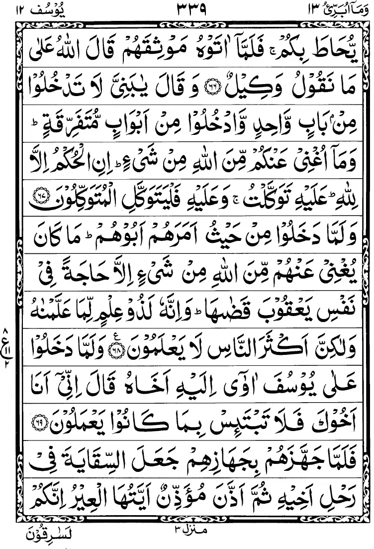 - Wa lammaa dakhaloo min haisu amarahum aboohum maa kaana yughnee ‘anhum minal laahi min shai’in illaa haajatan fee nafsi Ya’qooba qadaahaa; wa innahoo lazoo ‘ilmil limaa ‘allamnaahu wa laakinna aksaran naasi laa ya’lamoon (section 8)