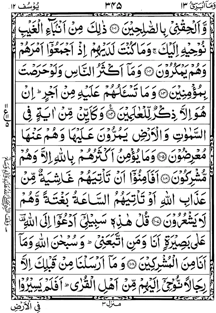 - Zaalika liya’lama annee lam akhunhu bilghaibi wa annal laaha laa yahdee kaidal khaaa’ineen (End Juz 12)