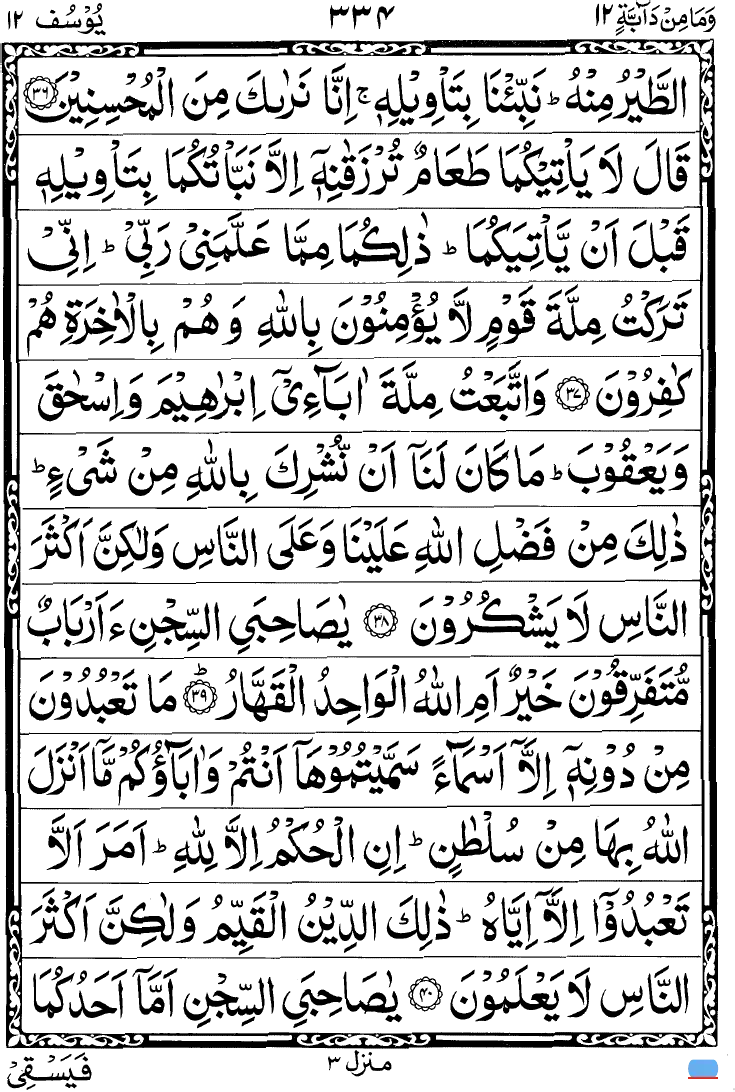 - Qaala laa ya’teekumaa ta’aamun turzaqaaniheee illaa nabba’tukumaa bi ta’weelihee; qabla any ya’ti yakumaa; zaalikumaa mimmaa ‘allamanee rabbee; innee taraktu millata qawmil laa yu’minoona billaahi wahum bil aakhirati hum kaafiroon