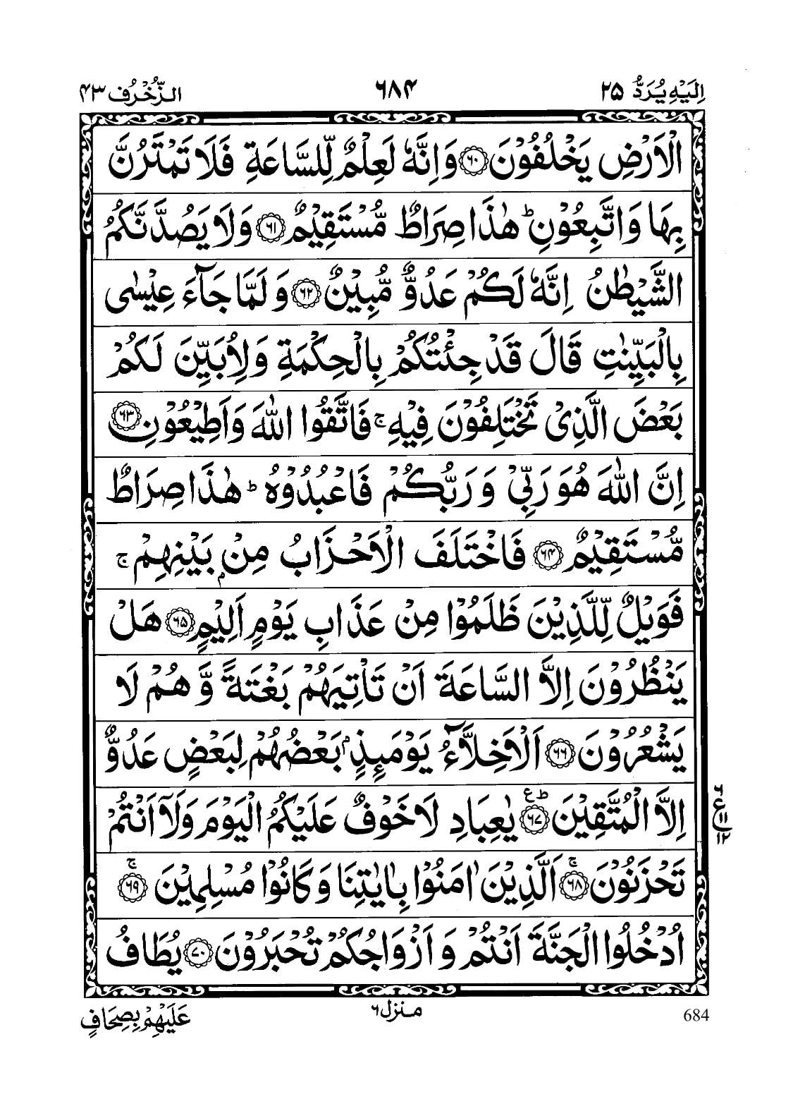 - Wa innahoo la ‘ilmun lis Saa’ati fa laa tamtarunna bihaa wattabi’oon; haazaa Siraatun Mustaqeem
