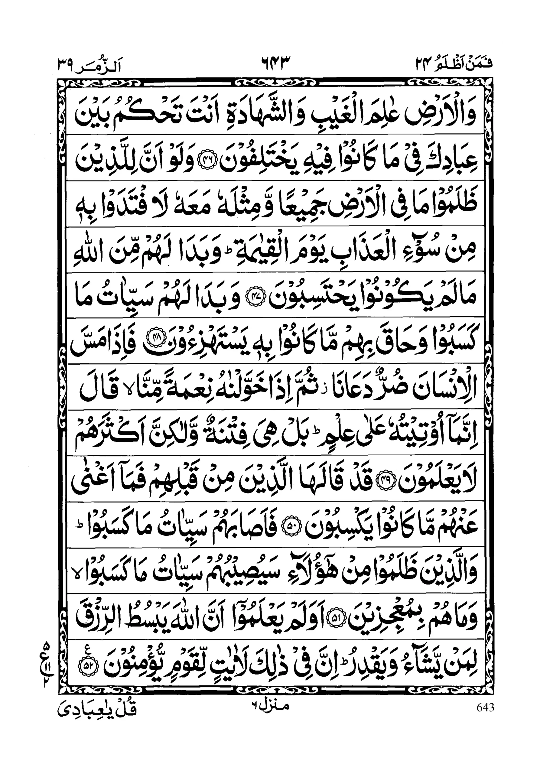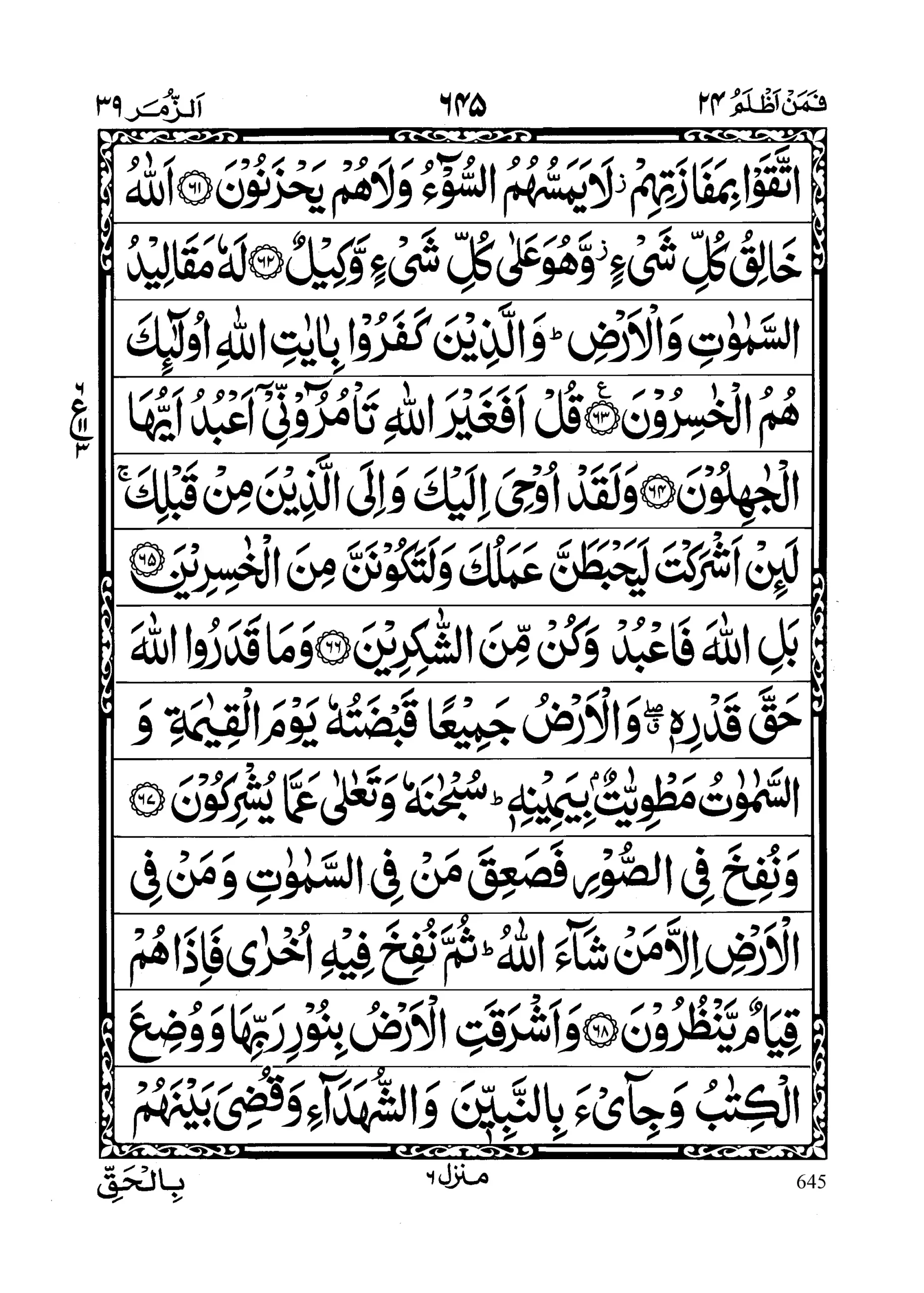 - Wa ashraqatil ardu binoori Rabbihaa wa wudi’al Kitaabu wa jeee’a bin nabiyyeena wash shuhadaaa’i wa qudiya bainahum bilhaqqi wa hum laa yuzlamoon