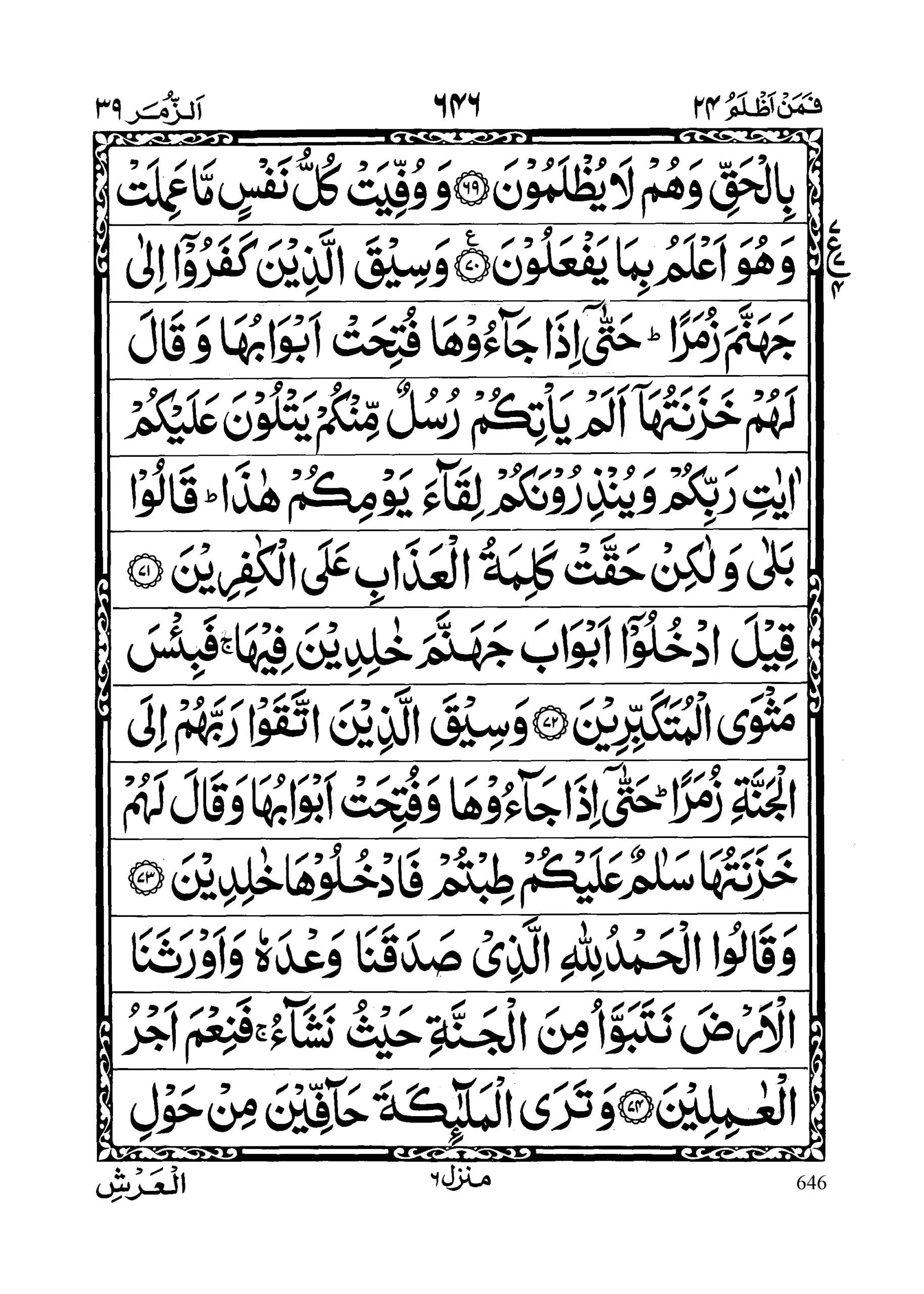 - Wa seeqal lazeena kafaroo ilaa jahannama zumaraa hattaaa izaa jaaa’oohaa futihat abwaabuhaa wa qaala lahum khazanatuhaaa alam ya’tikum Rusulun minkum yatloona ‘alaikum Aayaati Rabbikum wa yunziroonakum liqaaa’a Yawmikum haazaa; qaaloo balaa wa laakin haqqat kalimatul ‘azaabi ‘alal kaafireen