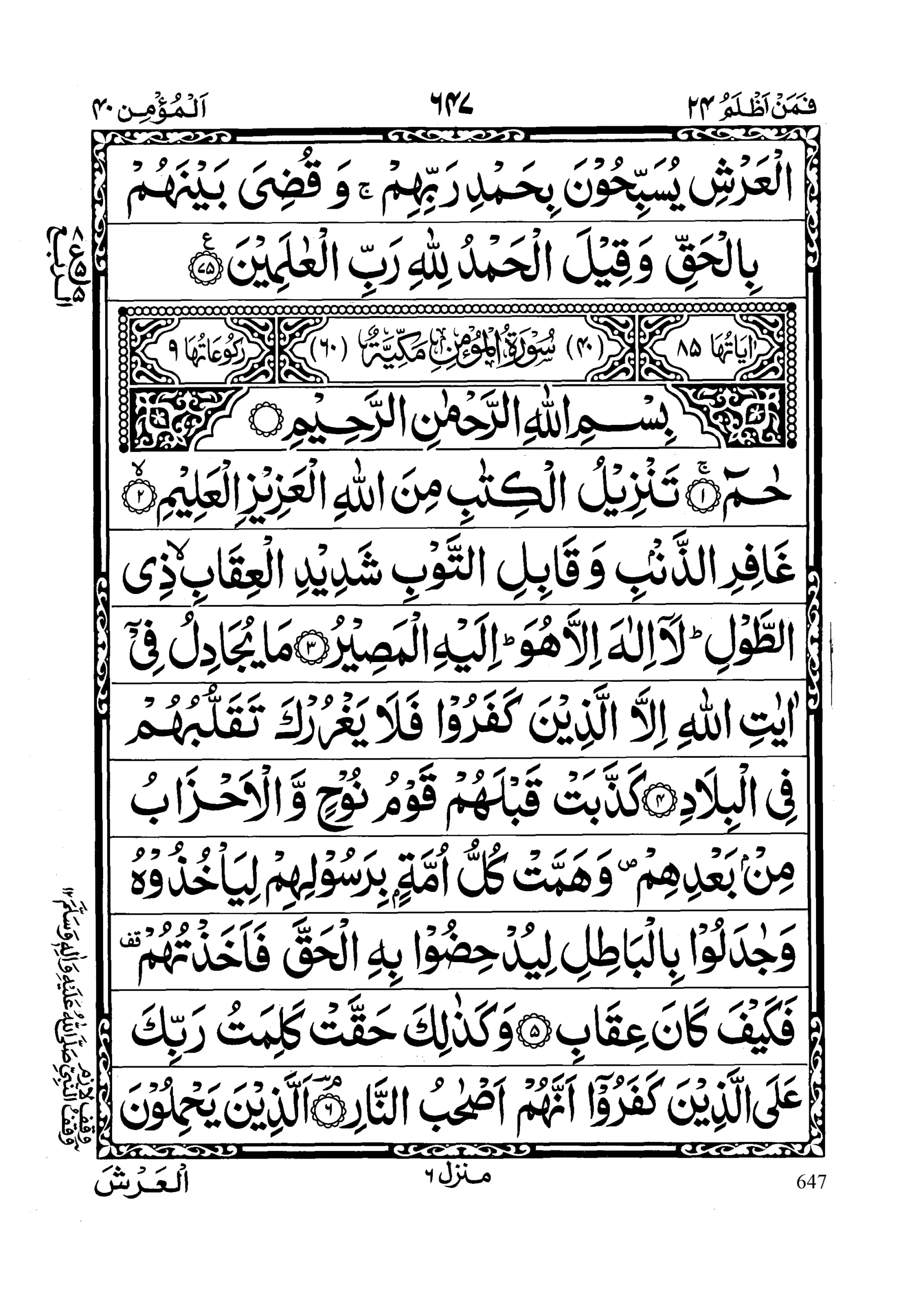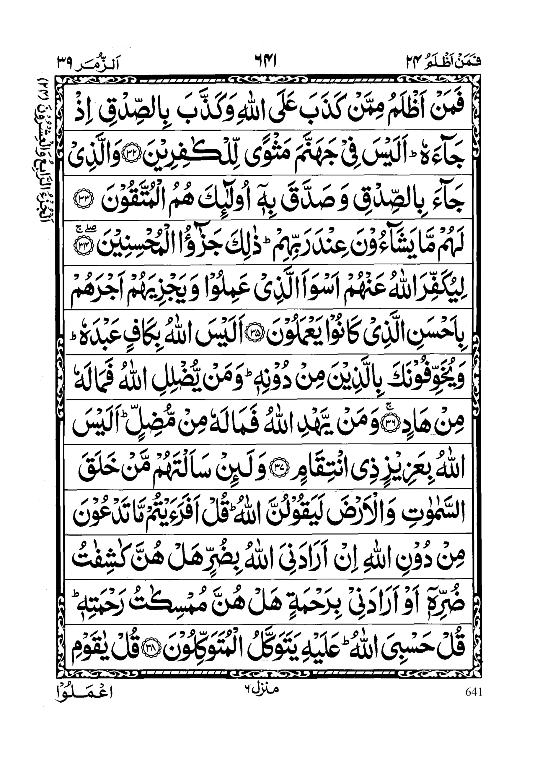 - Wa taral malaaa’ikata haaaffeena min hawlil ‘Arshi yusabbihoona bihamdi Rabbihim wa qudiya bainahum bilhaqqi wa qeelal hamdu lillaahi Rabbil ‘aalameen (section 8)