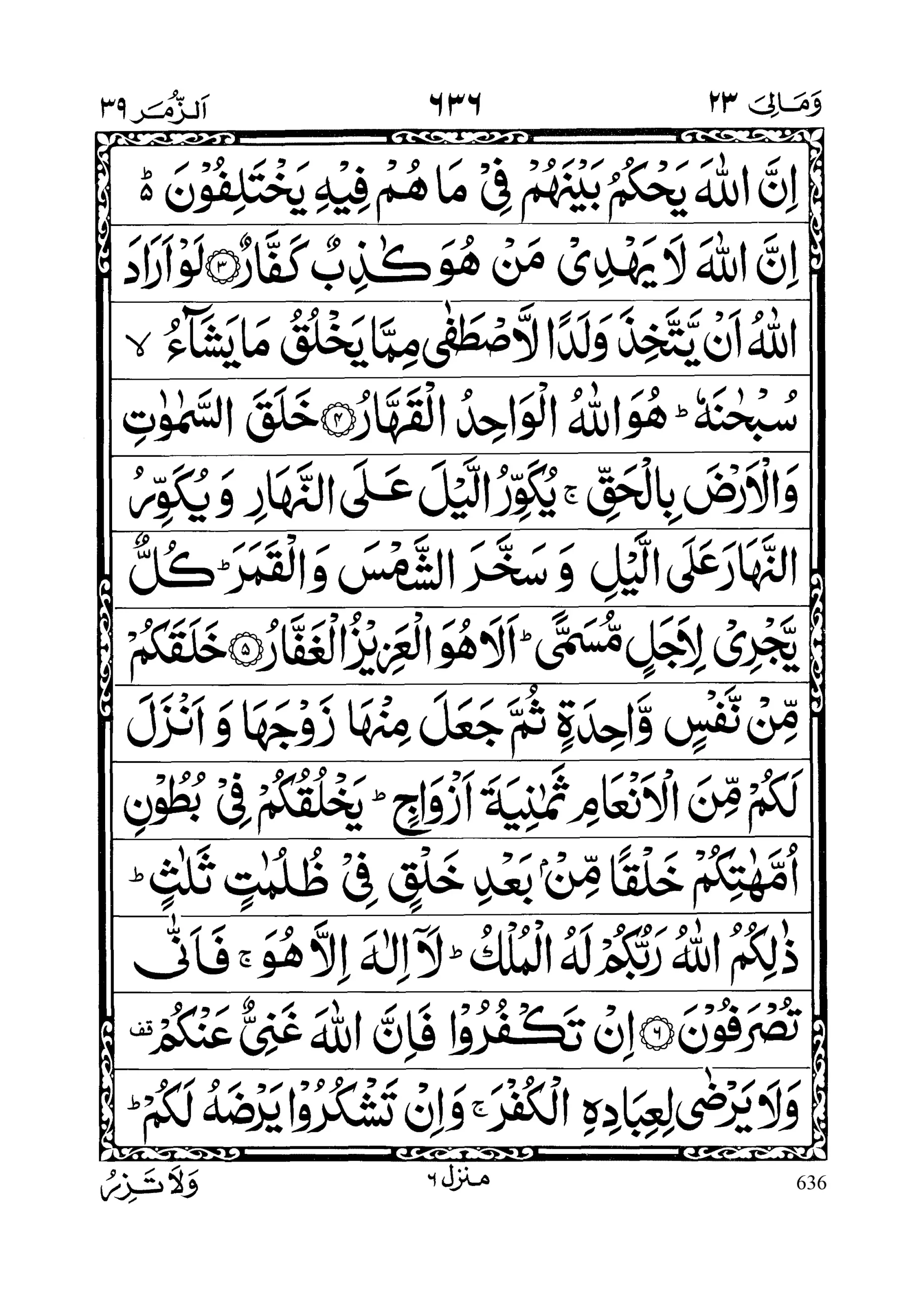 - Khalaqakum min nafsinw waahidatin summa ja’ala minhaa zawjahaa wa anzala lakum minal-an’aami samaani yata azwaaj; yakhlu qukum fee butooni ummahaatikum khalqam mim ba’di khalqin fee zulumaatin salaas; zaalikumul laahu Rabbukum lahul mulk; laaa ilaaha illaa Huwa fa annaa tusrafoon