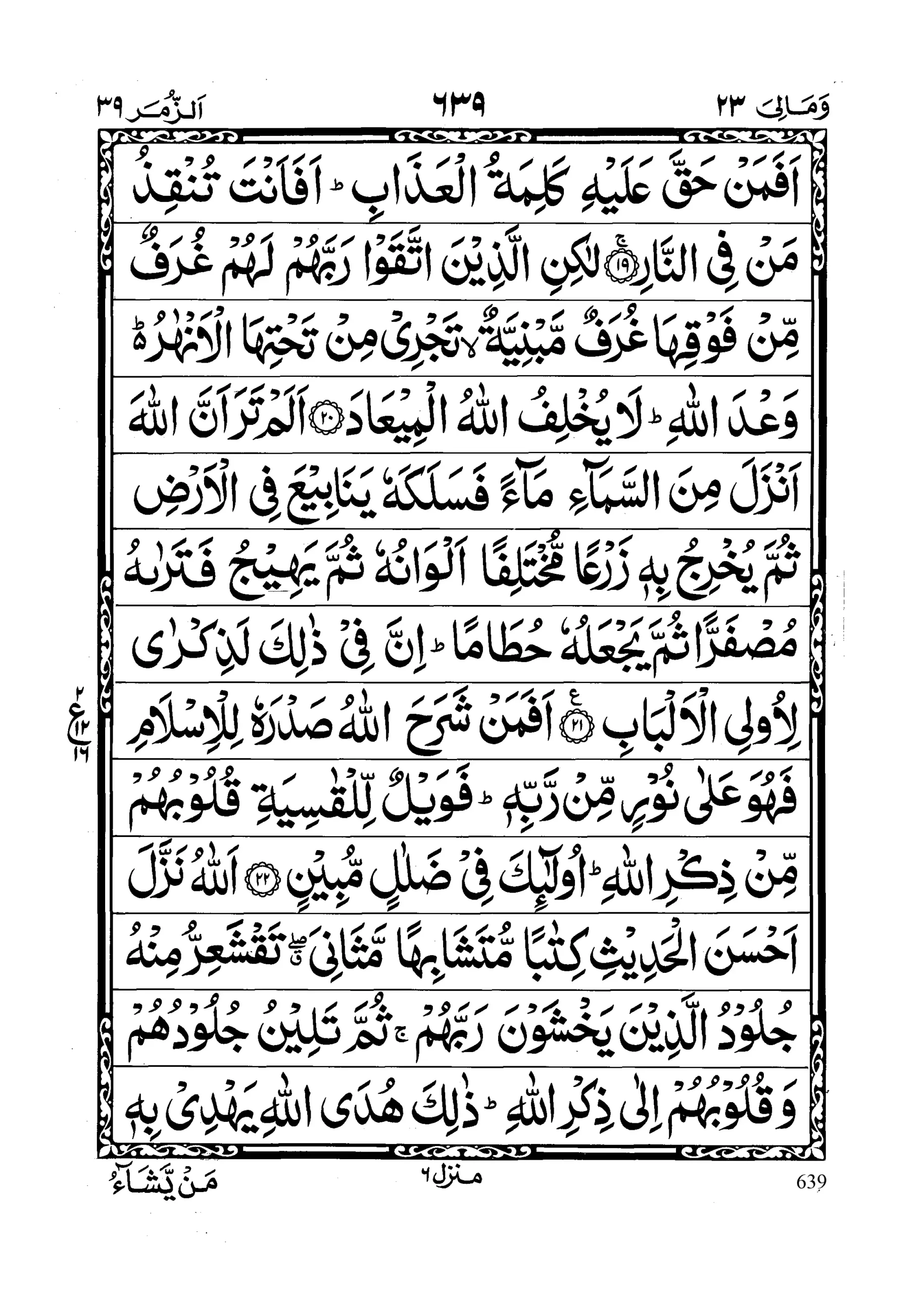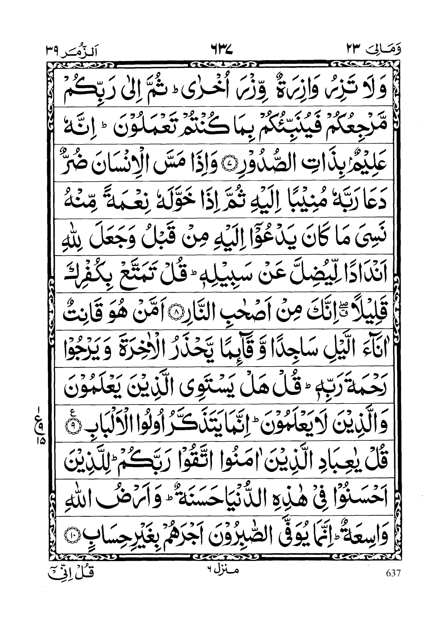 - Amman huwa qaanitun aanaaa’al laili saajidanw wa qaaa’imai yahzarul Aakhirata wa yarjoo rahmata Rabbih; qul hal yastawil lazeena ya’lamoona wallazeena laa ya’lamoon; innamaa yatazakkaru ulul albaab (section 1)